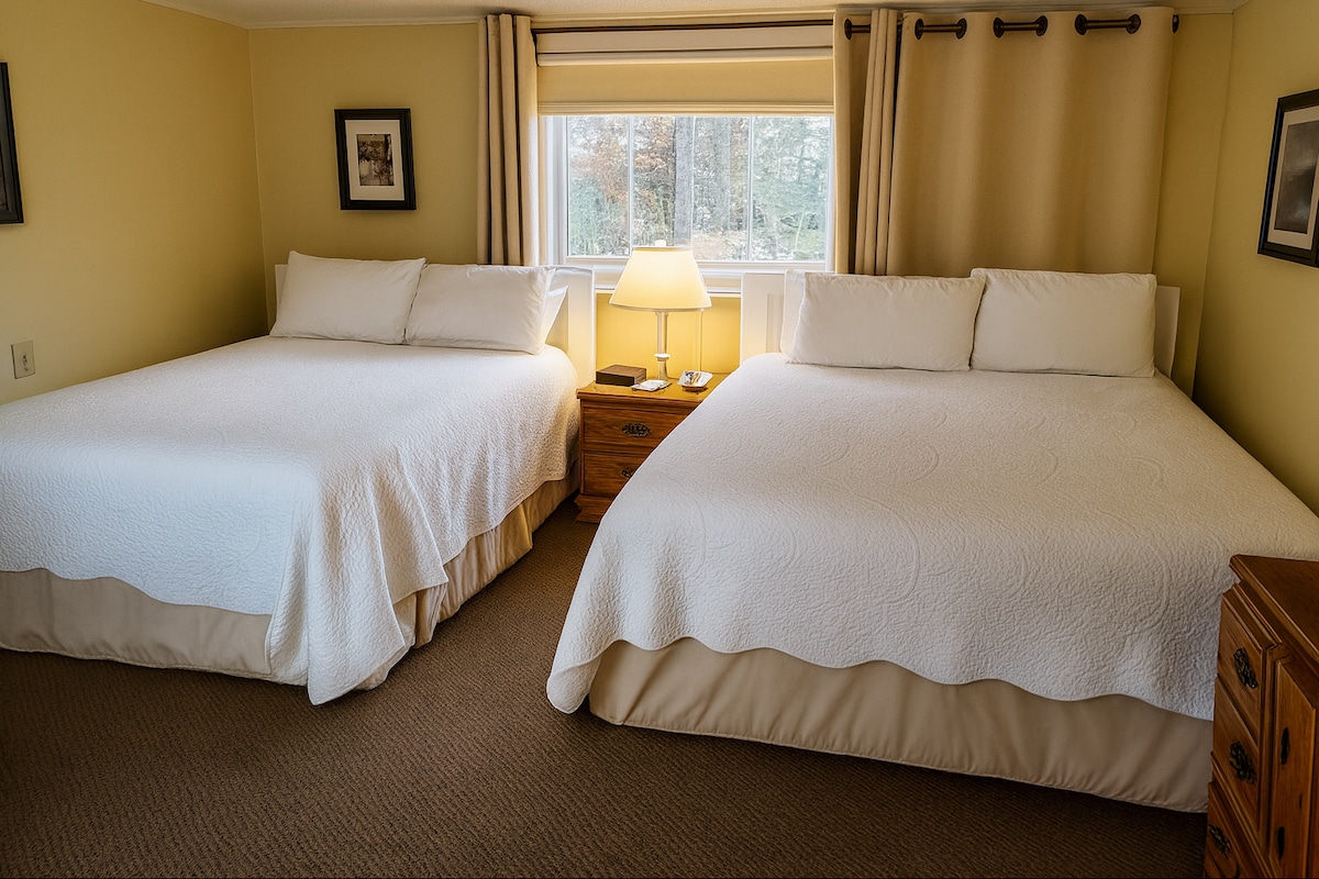 Kamar Gaya Hotel dengan 2 tempat tidur queen, kamar mandi lengkap, meja/kursi, kulkas mini, microwave, pembuat kopi, dan teras tertutup. Kami berlokasi di lingkungan county yang tenang, jauh dari keramaian. Kami memiliki akses jalur ATV & Snowmobile langsung, dan banyak tempat parkir untuk truk/trailer.