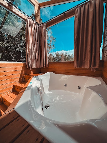 Kabin di puncak pohon dengan bak mandi air panas, kolam renang & jalur lintas alam