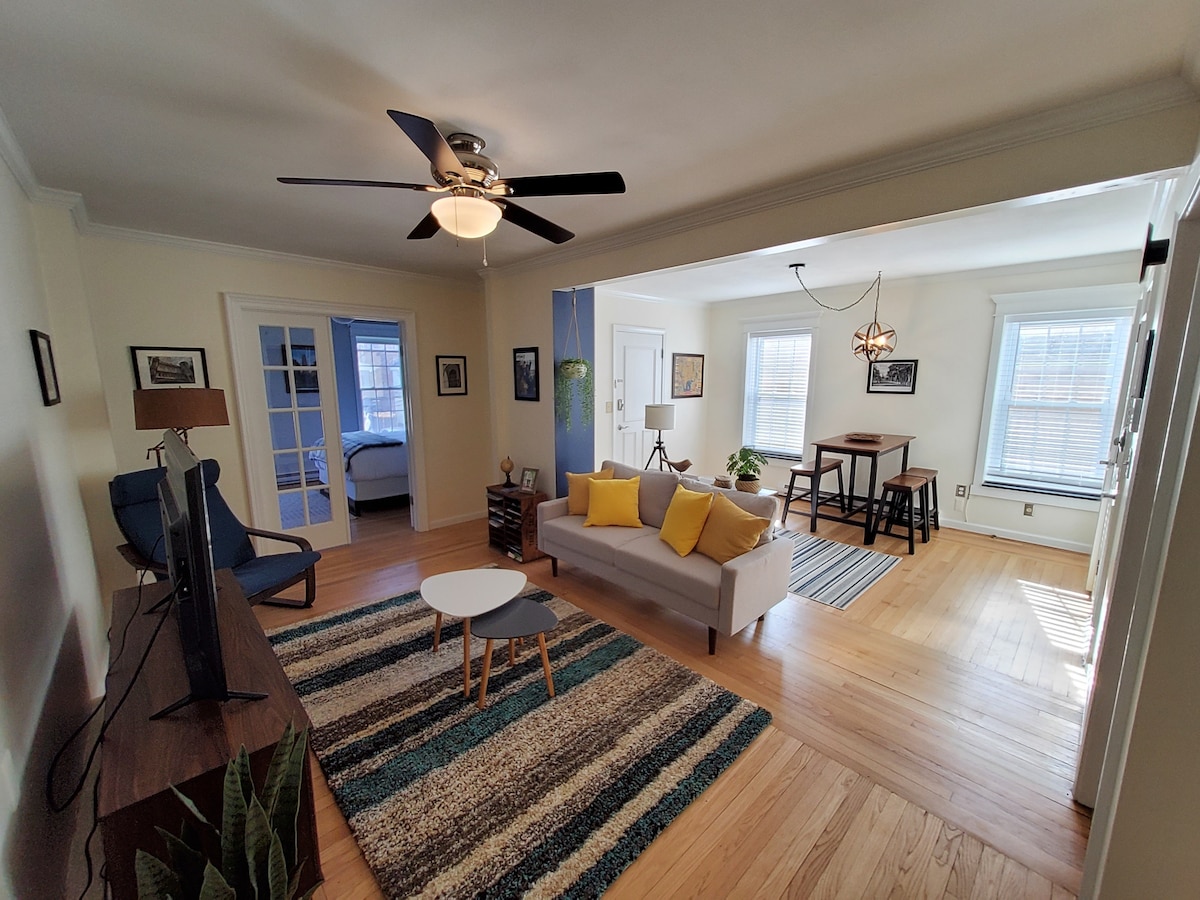 Menginaplah di jantung kampus Yale di Mansfield Street yang bersejarah tepat di seberang arena hoki Yale. Apartemen taman satu kamar tidur yang nyaman ini memiliki pintu masuk halaman belakang pribadi, satu kamar tidur, dapur lengkap, kamar mandi, area makan, TV dengan layanan streaming, dan tempat tidur queen kedua di area umum. Harap perhatikan bahwa ini adalah unit taman dengan langit - langit setinggi 9 kaki. Apartemen taman ini sebagian berada di atas tanah/sebagian di bawah tanah. Tamu bisa memarkir satu mobil di jalan masuk