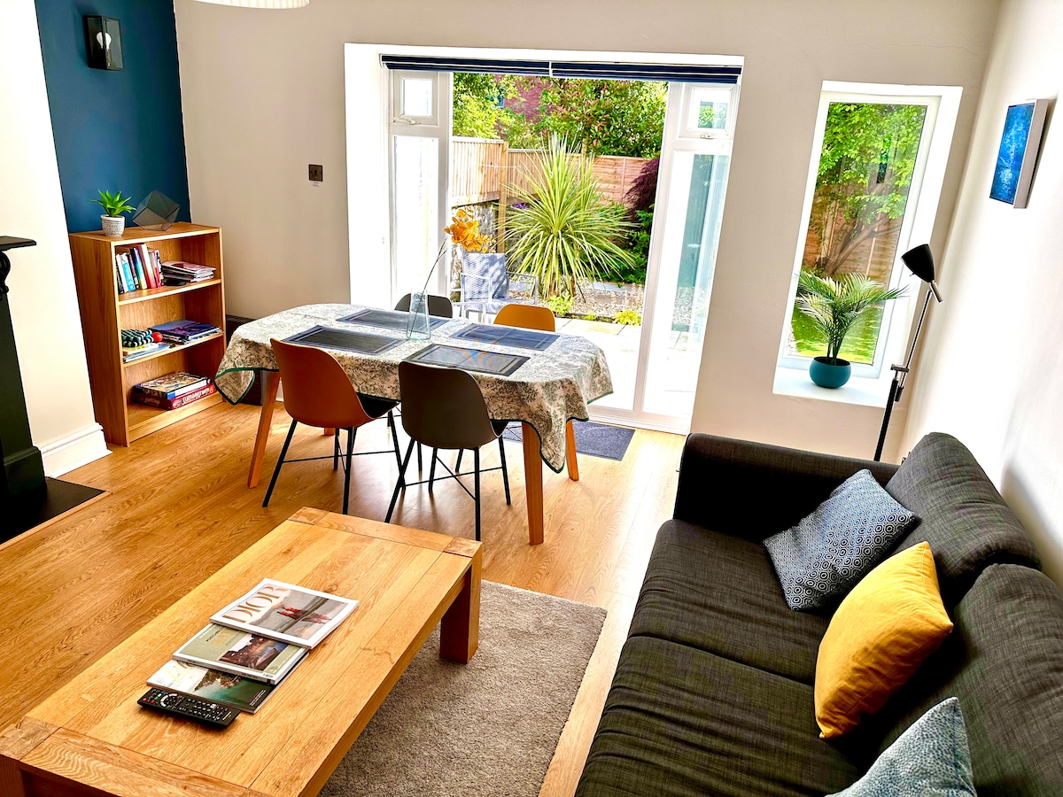 Flat taman 2 kamar tidur ganda yang didekorasi dengan gaya dan nyaman dan berlokasi di pusat kota yang menawarkan kamar - kamar besar yang lapang dengan fitur bergaya Victoria dalam suasana rumah - dari rumah. Pintu patio terbuka ke taman pribadi yang damai dengan manfaat tambahan parkir off - road gratis. Sambil menikmati suasana yang tenang, kami dapat berjalan kaki ke banyak toko, kafe, bar, dan restoran independen serta jalur transportasi yang baik. Gelombang panas? Tidak masalah - sejuk di musim panas, tetapi nyaman di musim dingin