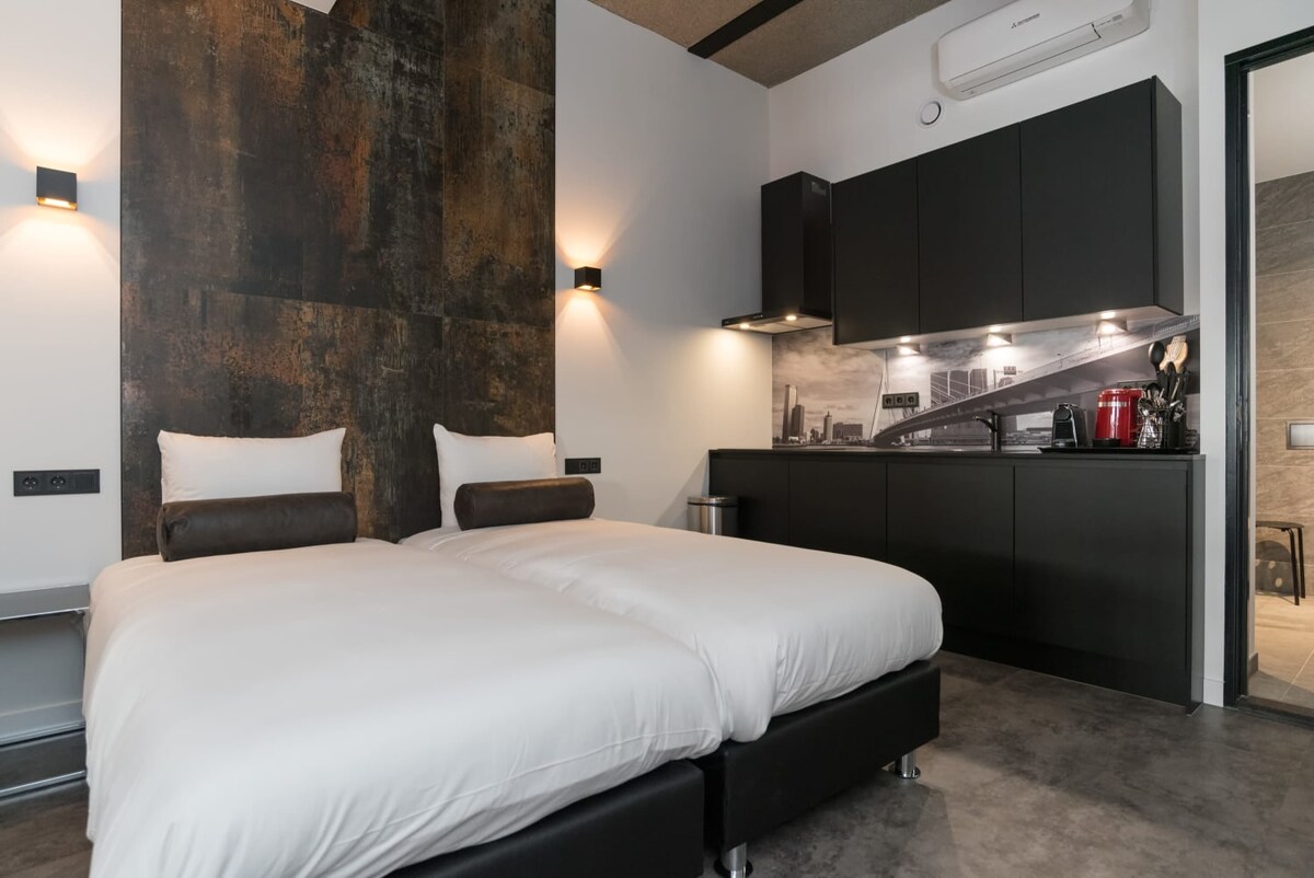 Loteng industri modern (68 m²) dengan jendela dari lantai hingga langit-langit di lantai 11 dengan pemandangan menakjubkan - siang dan malam - di pelabuhan Rotterdam dan pusat kota. Supermarket, gym, teras matahari, dan parkir di gedung yang sama. Transportasi umum dan taksi/bus air tepat di seberang jalan. Loteng ini terletak di Lloydkwartier yang trendi & kreatif dengan beberapa restoran dan Euromast yang ikonis dan taman hanya berjarak 5 menit berjalan kaki. - Check in jarak jauh - Disanitasi sebelum & sesudah masa inap