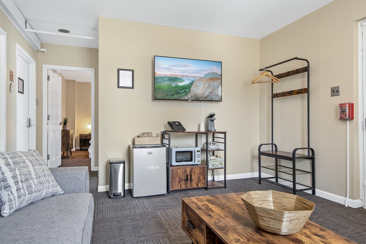 Lokasi, Lokasi, terbaik di kota. Berjalanlah ke kehidupan malam, restoran, dan trotoar, dari suite lantai dua modern ini. Berisi 2 tempat tidur queen, kamar mandi besar, dan dapur kecil untuk segala kenyamanan rumah. Kami mewajibkan uang jaminan tunai untuk 3 tamu atau lebih atau siapa saja yang berusia di bawah 35 tahun atau saat check-in. Ini akan dikembalikan saat check-out jika tidak ada kerusakan di dalam atau di luar unit, semua sampah dibuang, seprai tidak rusak, dan unit dibiarkan dalam kondisi yang sama seperti saat Anda check-in