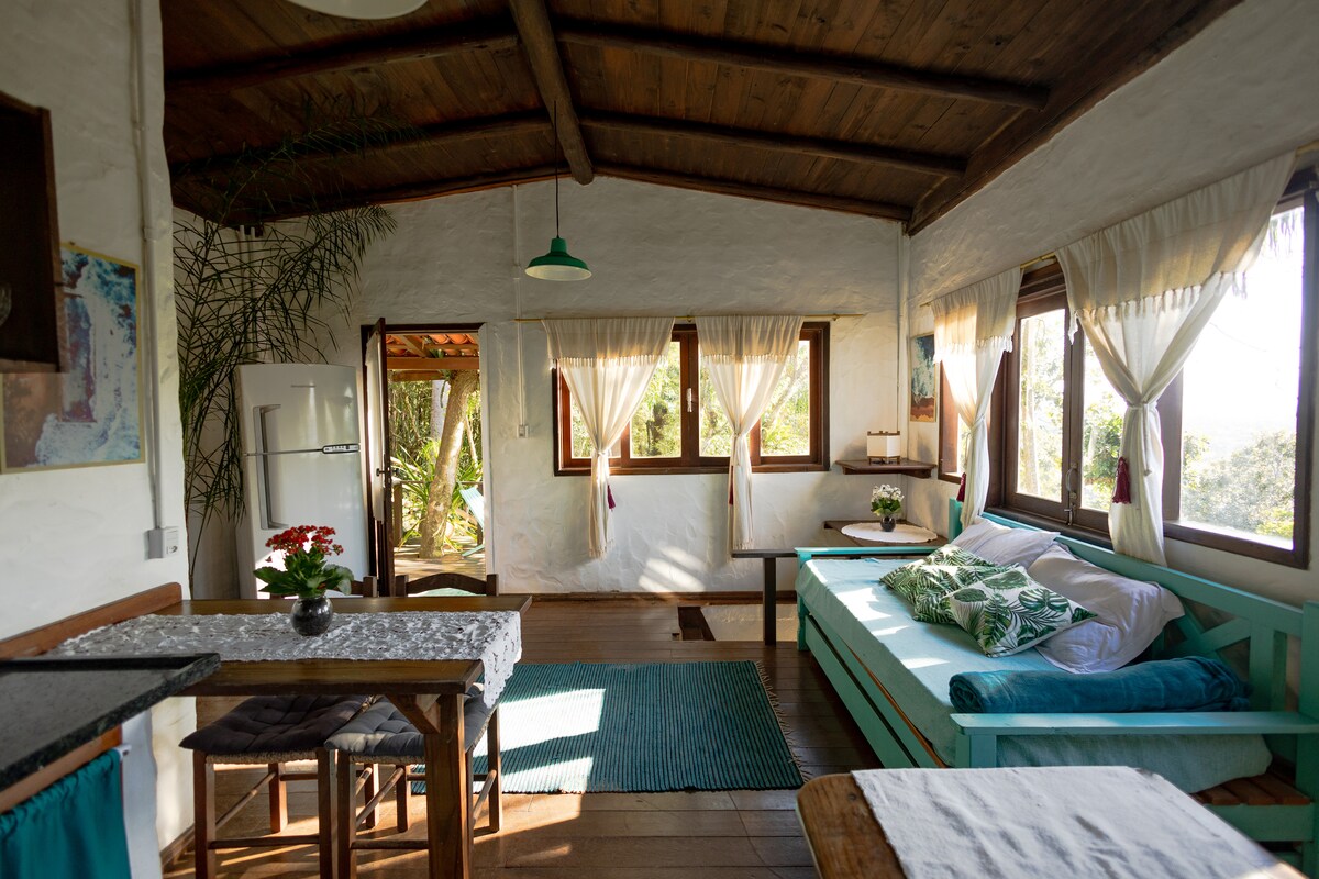 Sangat menawan dan romantis, ideal untuk pasangan. Terletak di atas bukit, dengan alam total di sekitarnya. Dekat pantai Joaquina 15 menit berjalan kaki, dan 10 menit dari pusat Lagoa da Conceição. IDEAL UNTUK PETUALANG. Tempat ini memiliki WI - FI cepat, dapur lengkap dengan barang - barang dasar, seprai tempat tidur, handuk. Tempat ini memiliki mini market dan restoran di dekatnya 10, 15 menit berjalan kaki. IDEAL UNTUK ADVENTUREIROS. Tempat ini memiliki Wifi yang bagus, TV, dapur lengkap dengan barang - barang dasar, seprai, handuk.