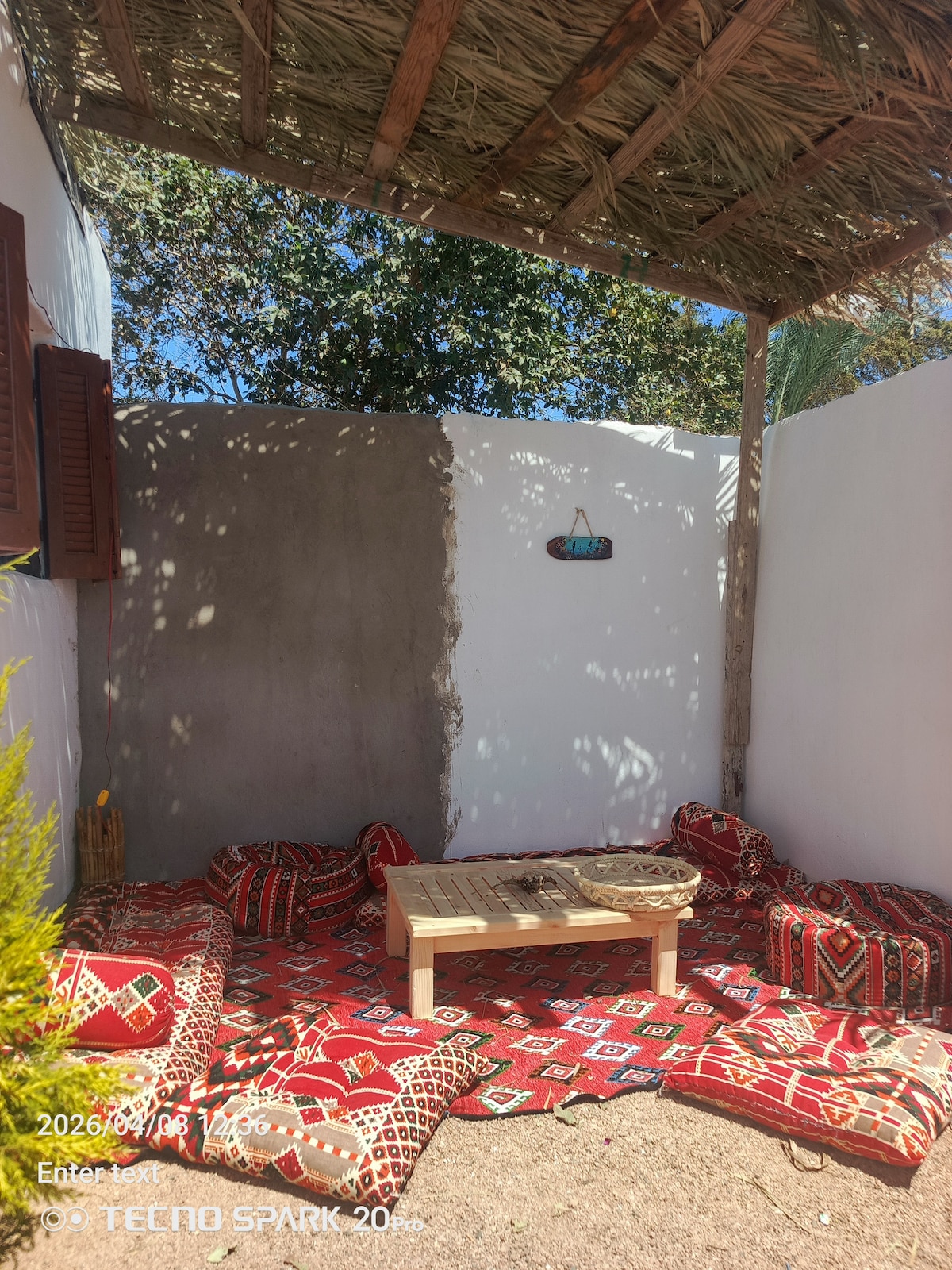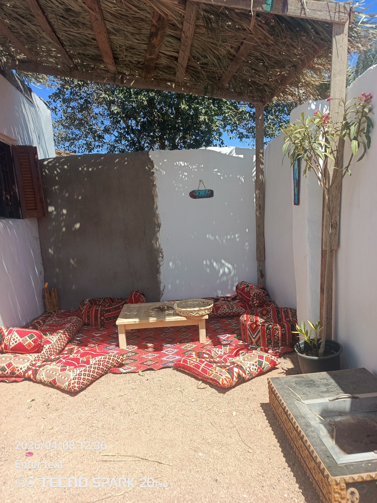 Selamat datang di tempat persembunyian atap yang bermandikan sinar matahari di area Mercusuar utama Dahab. Hanya beberapa menit berjalan kaki dari laut, kafe, dan pusat penyelaman, namun tersembunyi di halaman yang tenang jauh dari jalan. Yang paling menarik adalah teras atap pribadi yang besar dengan pergola kayu dan angin laut — tempat liburan kecil yang sempurna di atas Dahab.