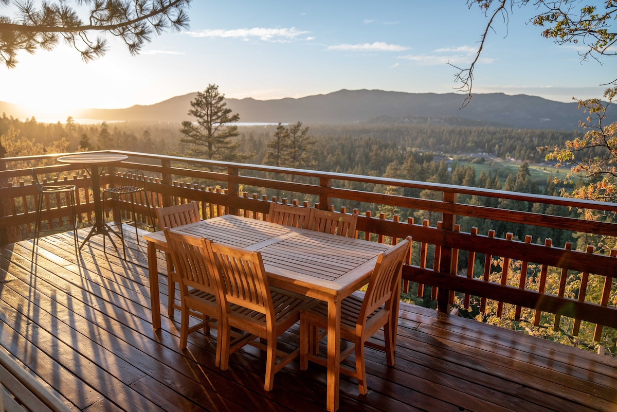 Mountain Retreat dengan pemandangan danau & lereng. A - Frame dengan perapian, dapur, kamar mandi & dek pembungkus. Loteng terbuka memungkinkan pemandangan, dan dek besar kedua memiliki bak mandi air panas. Saksikan lereng saat Anda bersantai setelah seharian bermain ski, memancing, atau hiking! Hanya beberapa menit ke pusat kota dan semua yang ditawarkan Big Bear. Properti terletak beberapa menit ke segalanya namun terselip jadi begitu kamu masuk pintu depan, yang kamu lihat hanyalah danau dan lerengnya! Masa inap 3 Hari Min selama liburan. Pengisi daya Mobil Listrik tersedia!