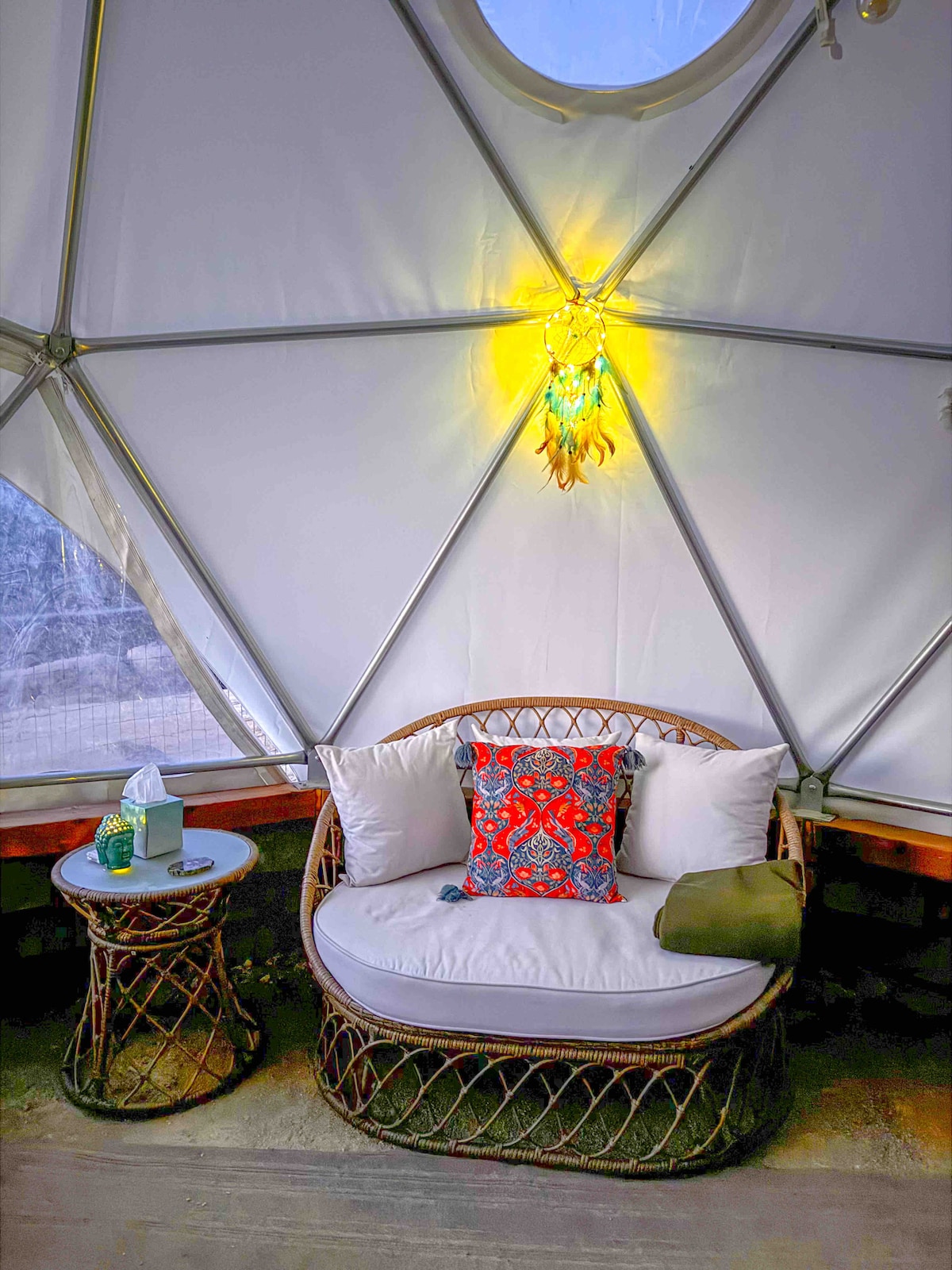 Kubah kami adalah struktur setengah bulan yang menampilkan tempat tidur busa memori berukuran king dan pancuran luar ruangan di bawah pohon merica, sementara deknya memberikan pemandangan puncak bukit yang menakjubkan. Kami berlokasi di komunitas berpagar yang dekat dengan semua tempat wisata utama, dan tamu bisa menikmati matahari terbenam yang indah, langit berbintang, angin laut, dan mengamati burung (21 jenis). Kubah berukuran 200 kaki persegi dengan AC/pemanas, toilet luar (toilet kompos), dan pancuran luar ruangan, menjadikannya pilihan sempurna untuk glamping.