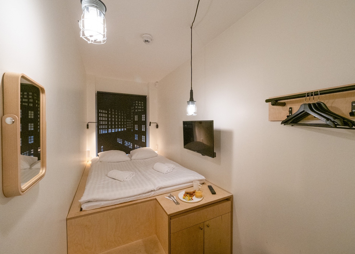 Kamar Mini adalah pilihan yang sangat baik untuk satu atau dua orang. Kamar Mini (6m²), dirancang dengan solusi kompak modern, memiliki tempat tidur selebar 140cm berkualitas tinggi. Kamar memiliki AC, TV layar datar, kulkas, dan peralatan makan. Anda dapat memasak makanan Anda sendiri di area dapur umum yang nyaman, tersedia di semua lantai. Hostel ini memiliki toilet umum yang bersih, pancuran, sauna, dan ruang cuci pakaian. Harganya termasuk WiFi, seprai, handuk, dan pembersihan akhir. Sistem pengunci kode yang baru memudahkan proses check - in.