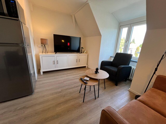 De knusse woonkamer is ideaal om te ontspannen en TV te kijken. De kitchenette is klein maar zeer compleet ingericht incl. vaatwasser. De slaapkamer straalt rust en comfort uit, met een luxe boxspring voor een goede nachtrust. Dankzij de zachte verlichting en een praktisch bureau is het ook een fijne plek om te lezen of te werken. De badkamer is ruim, en voorzien van een wastafel, douche en wasmachine en droger. Let op: appartement is op 2e verdieping, 2 trappen. Geen balkon of buitenruimte.