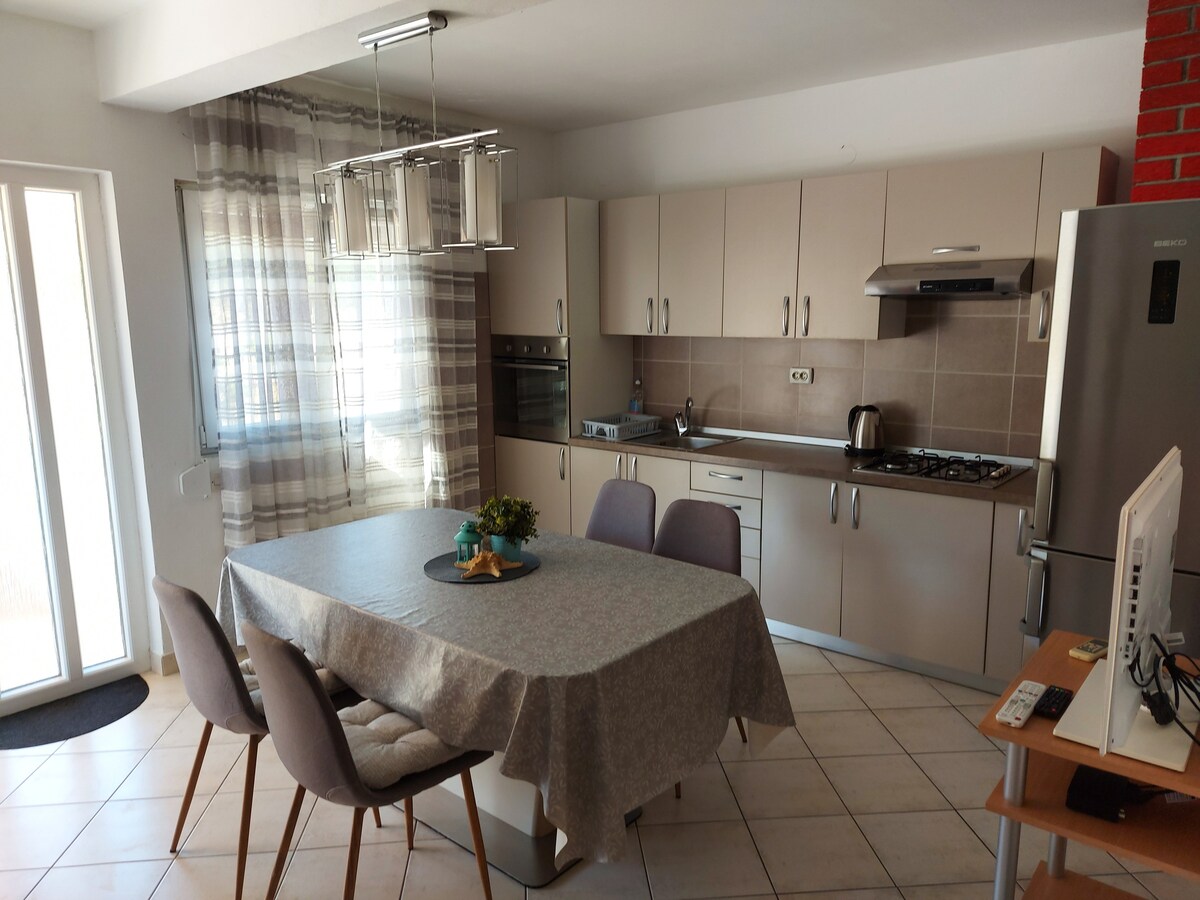 Apartemen baru dan mondern ini sangat ideal untuk keluarga dengan anak - anak. Apartemen ini dekat dengan pantai Slanica yang paling populer dan berjarak 10 menit berjalan kaki ke pusat. Apartemen ini lengkap(AC,tv,wifi, dan mesin cuci)Anda juga memiliki parkir pribadi di depan rumah. Ada dua balkon. Yang depan berjarak sekitar 35m2 dan yang kedua berukuran kecil dari mana Anda bisa melihat laut. Ada dua kamar tidur, dapur besar, dan kamar mandi.