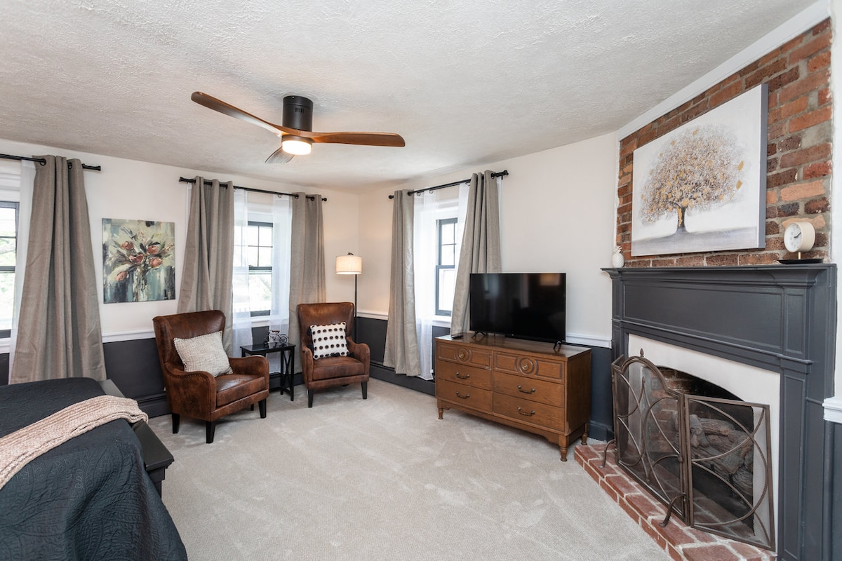 Pekerjaan batu bata yang terpapar (sekitar 1790) menciptakan ceruk yang menawan untuk tempat tidur dan kursi berukuran queen di dekat perapian gas - log (musiman). Ruang ganti terpisah ditemukan di samping kamar mandi yang diperbarui dengan bak berendam dan pancuran terpisah. Dinding bata interior 15 inci memastikan masa inap yang nyaman, tenang, dan pribadi! Kamar ini berada di lantai dua.