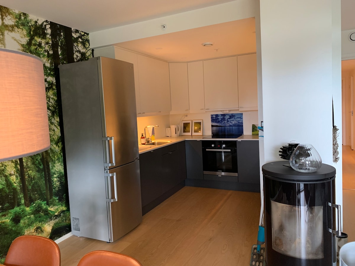 Selamat datang di apartemen yang menawan dengan pemandangan yang indah - laut, fjord, dan pegunungan. Nikmati kopi pagi Anda di balkon berkaca dengan suara ombak, atau berendam di pantai berpasir pribadi yang menyegarkan di luar. Apartemen ini memiliki dua kamar tidur – satu dengan tempat tidur double dan satu dengan sofa bed - juga cocok sebagai kantor. Tempat tidur siap pakai, kopi gratis dari mesin kopi, WiFi, dan parkir gratis memberi Anda pengalaman yang menyenangkan dan bebas repot. Di area yang paling dicari di kota, dekat dengan laut dan pusat kota.
