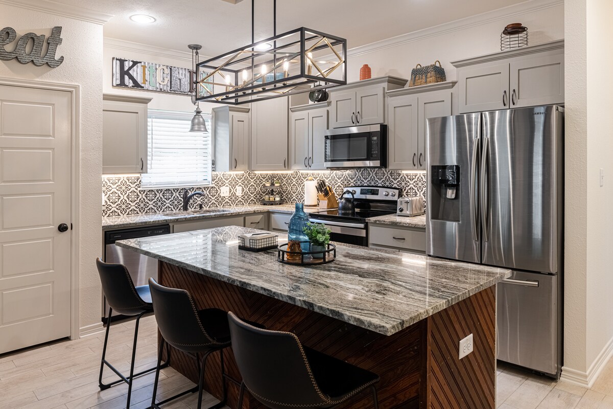 Bersantai di rumah kota "Mid Century Modern" baru yang berlokasi di Pusat Kota Bersejarah Bryan & dalam jarak berjalan kaki ke Ronin, Black Water Draw, RX Pizza, Desa, Cilantro & banyak lagi Restoran. Kamar tidur utama memiliki tempat tidur berukuran king & setiap kamar memiliki 58 plus Smart TV.. Masuk ke akun streaming pribadi Anda atau gunakan Hulu, Disney, atau ESPN kami, sebagai rasa hormat. Bersantai di halaman belakang pribadi dengan pemandangan indah atau memasak di dapur yang indah yang mencakup pembuat kopi Keurig dengan polong & krimer.
