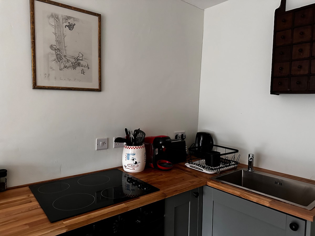 Ini adalah lampiran mandiri di atas garasi ganda (harap perhatikan sudut atap rendah di beberapa tempat) dengan pintu independen. Tempat ini memiliki satu tempat tidur berukuran king dengan beberapa tempat duduk dan TV dan meja makan. Ada dapur kecil termasuk microwave, kulkas, ketel, dan pemanggang roti. Kamar mandi ini memiliki pancuran listrik dasar dan fasilitas biasa. Ada internet yang tersedia. Jika Anda ingin membawa anak, silakan hubungi kami sebelumnya untuk memeriksa bila sesuai. Ada tempat parkir di jalan utama atau di seberang dekat.