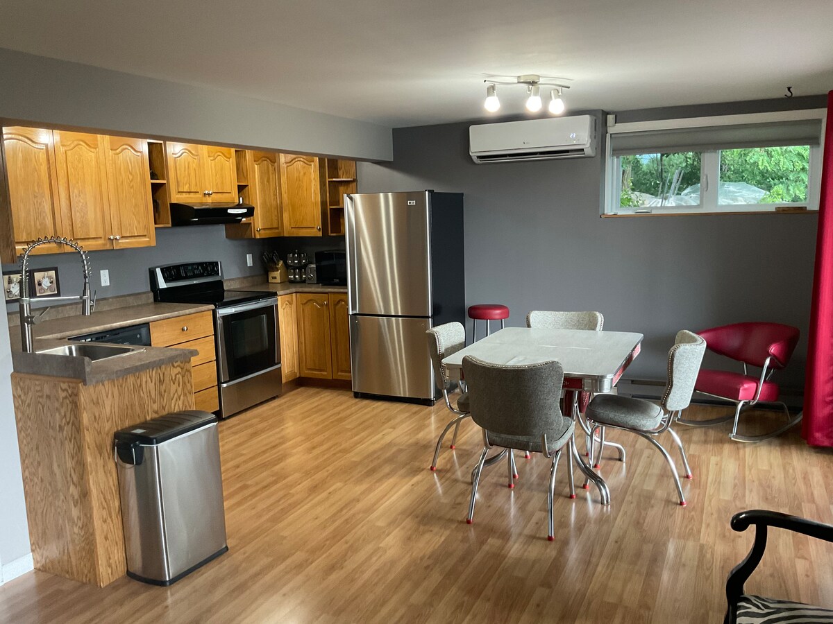 Notre résidence de tourisme en semi-campagne à 10 minutes du centre ville de Sherbrooke, du CHUS et de l’université Bishop’s. Les pièces sont grandes, la cuisine est complètement équipée. Idéal pour un couple ou une petite famille (petite chambre attenante). ** Donc il faut passer par la chambre principale pour accéder à la petite chambre. Vous apprécierez le logement pour sa luminosité, sa propreté, ses grands espaces extérieurs, sa tranquillité et la vue exceptionnelle Numéro CITQ 295015.