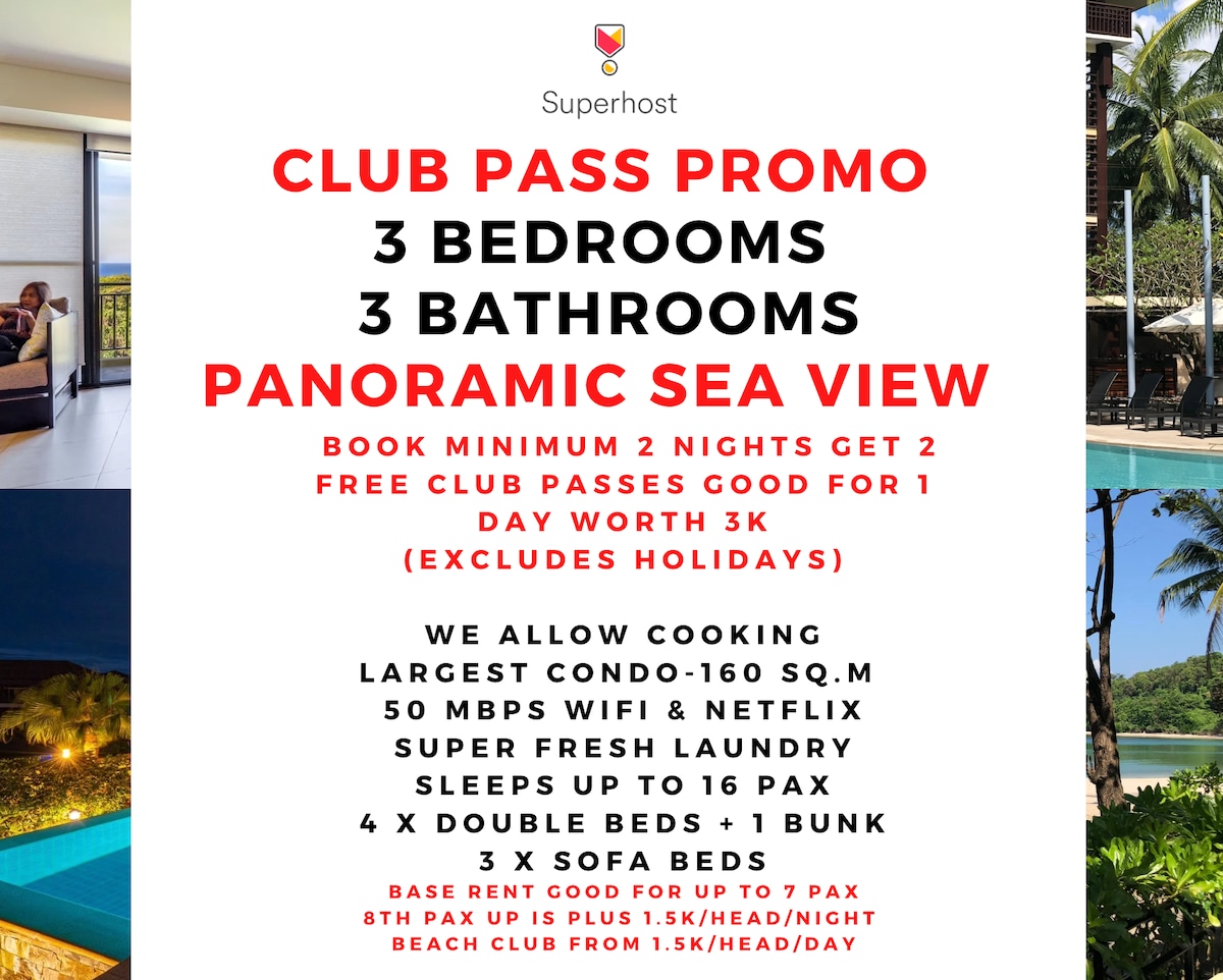 -Large 2BR Penthouse unit in the exclusive Anvaya Cove development,- -Base price is for 5 PAX, Additional 1000 per head up to max 10 PAX - Some Free Club Passes available - please enquire during time of booking - Rental includes free use of Stunning Condo infinity pool throughout your stay - Free WiFi & Cable TV. - Kitchen with cooking facilities microwave, rice cooker, kettle, toaster, ref. & kitchenware included