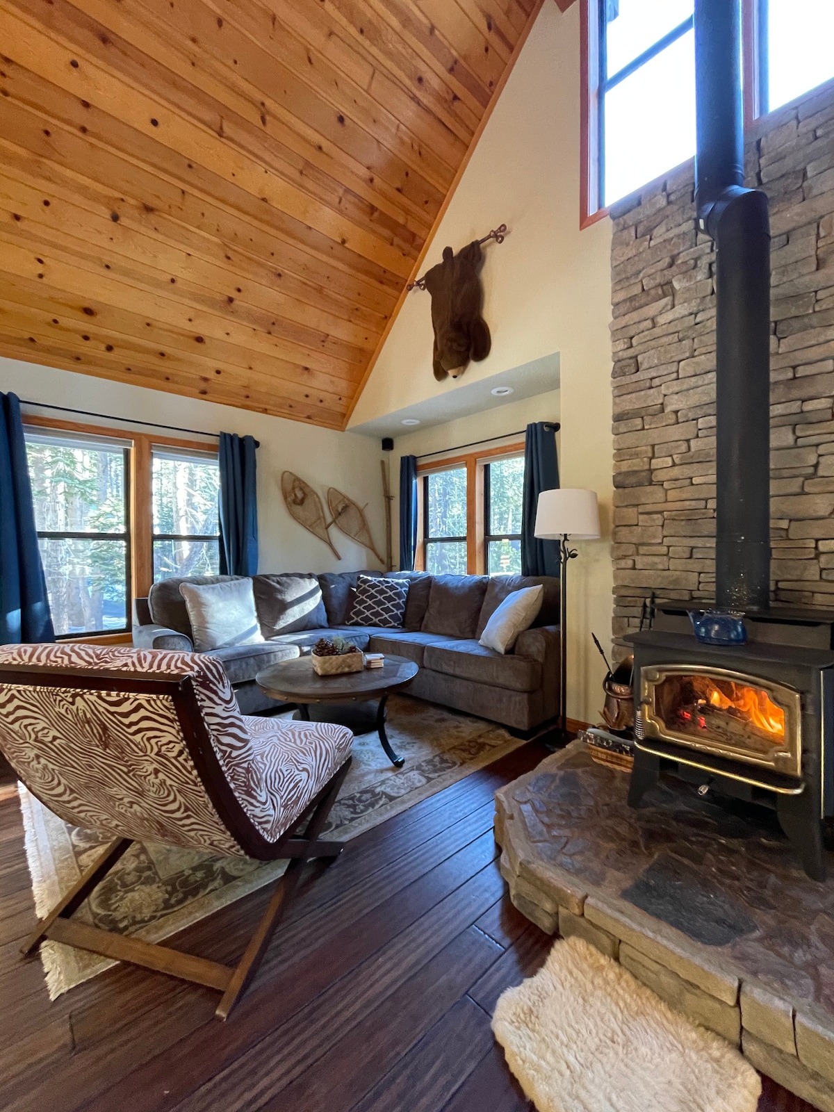 It’s a romantic hideaway. It’s a convenient family ski home. It’s a quiet writer’s retreat. No wait, it’s all three rolled into one! This dreamy 3 bedroom Bohemian chic cabin is nestled in a grove of pine trees on a secluded Tahoe Donner street. Minutes from town and all outdoor activities, peaceful and quiet like a mountain retreat, but with super fast wifi, too. Each charming and cozy room was thoughtfully decorated with love and care to make your stay a happy, homey, & comfortable one.