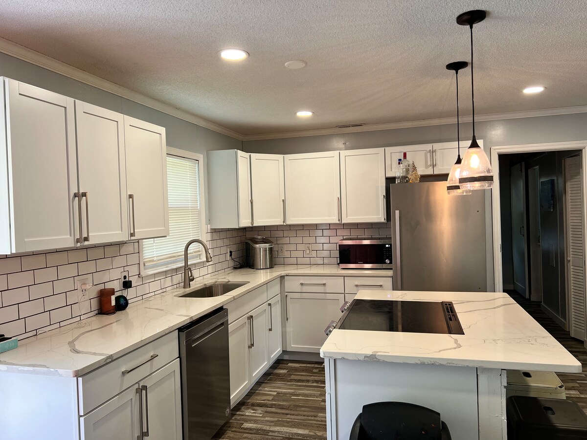 Locally known as the "Turtle's Nest", this getaway will let you be close to all the action. Located on Goat Island, 2nd row back, right off the big water. Boat ramp, boatslip, and restaurant only .3 miles away. Boatslip & ramp included. Remodled to a farmhouse feel, this 3 bedroom, 1 bath has 2 king beds & two singles. Two single beds share the same space as living room. Great retreat after a long day of fishing, or hanging out with family and friends. Be back fast to unwind by the firepit.