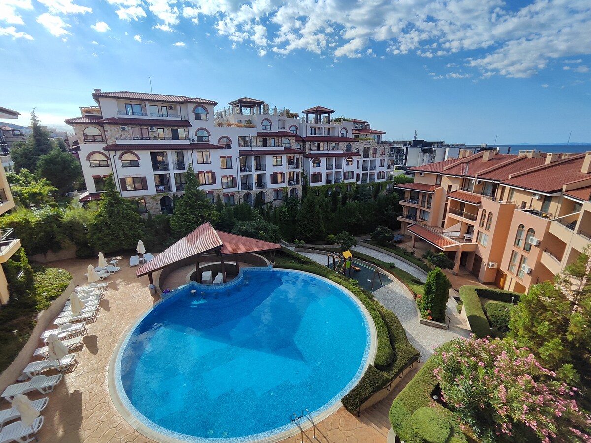 Flat ini baru dan berkilau. Lokasinya di sebelah pantai keemasan Sunny Beach yang indah - 300 meter berjalan kaki. Gedung ini merupakan kompleks pribadi baru dengan banyak fasilitas seperti kolam renang, taman, pusat kebugaran, resepsionis dan taman bermain anak. Anda memiliki akses ke semuanya. Apartemen ini memiliki semua kondisi yang dibutuhkan untuk liburan Anda - dapur lengkap Witch berisi mesin cuci piring, oven , kompor, kulkas, peralatan dapur. Juga terdapat mesin cuci dan mesin pengering, kamar mandi besar. Balkon memiliki pemandangan indah ke taman dan pegunungan. Tempat ini sempurna untuk minum kopi pagi. Di depan gedung terdapat dua supermarket. Ada meja kerja untuk destinasi wisata - tiket masuk untuk Aquapark, stasiun taksi, wisata, perjalanan dengan kuda.