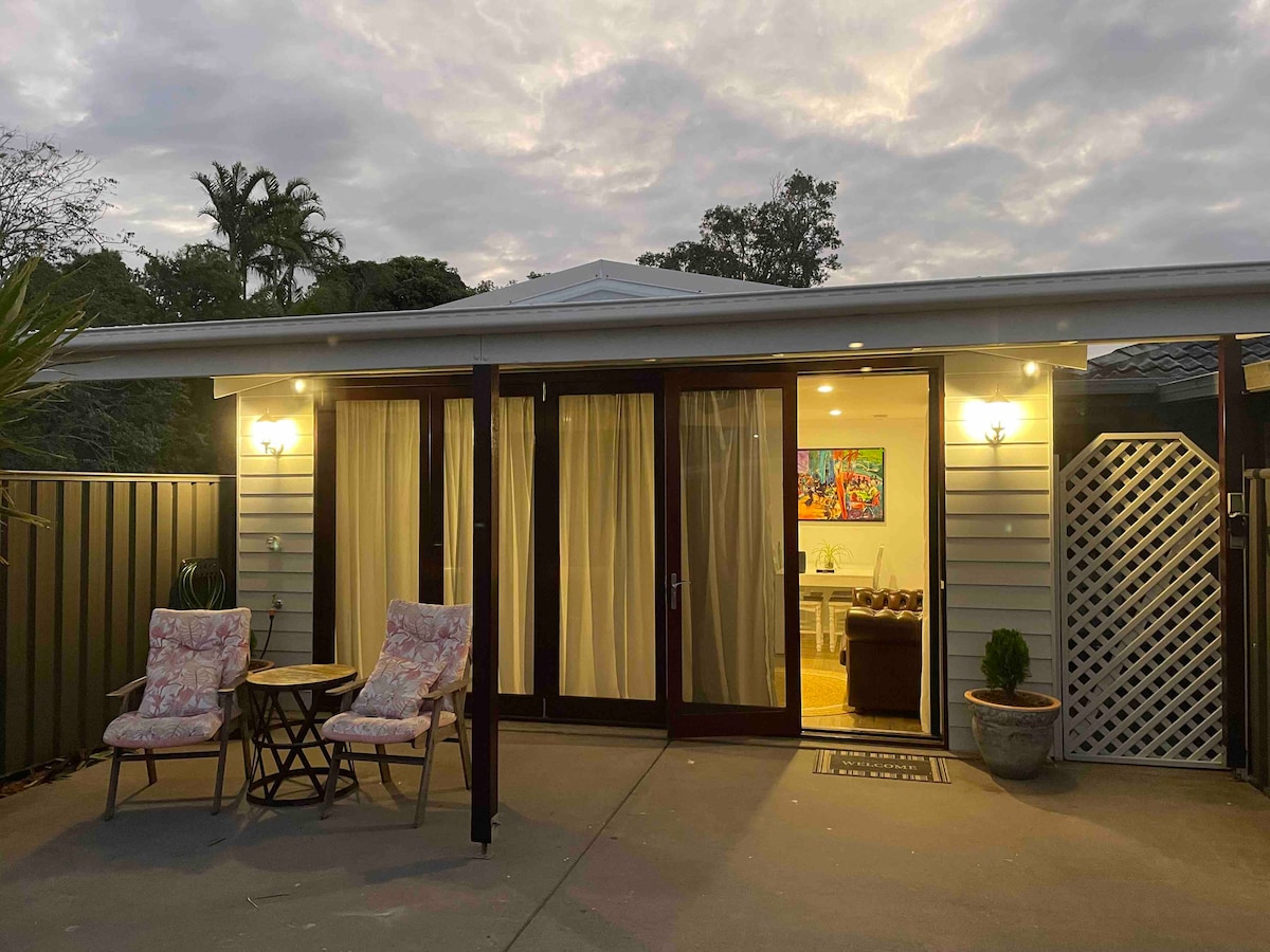 Studio mandiri yang terpisah dari hunian utama yang mengarah ke taman nasional, dengan jaringan jalur yang luas untuk hiking atau berlari. Ruang studio dengan kompor induksi, microwave dan BBQ di dek, penggunaan kolam renang bersama. Menit ke : 10 berjalan kaki ke pantai selancar murni yang tenang 7 kafe dan toko yang funky di Pantai Peregian 10 berkendara ke Noosa Junction 8 menit berjalan kaki ke halte bus - bus liburan gratis selama Natal dan Paskah di