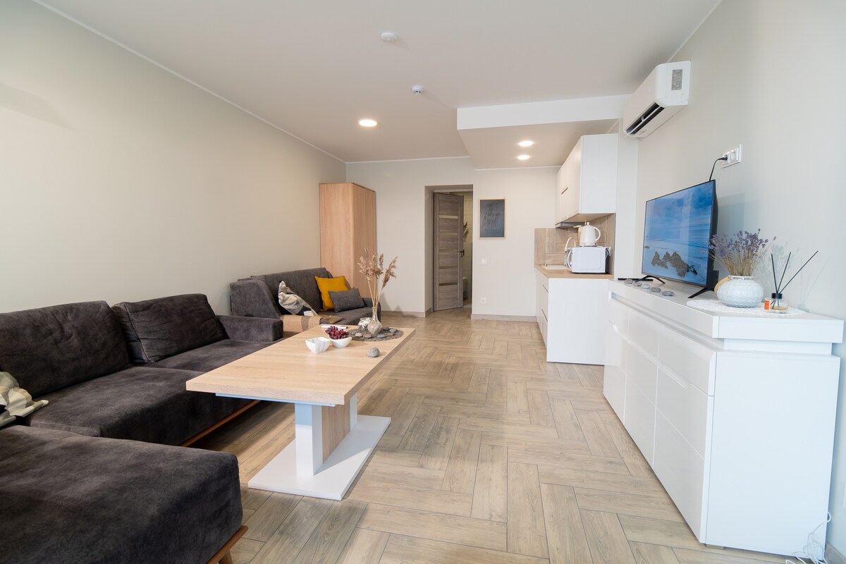 Properti studio 37 meter persegi yang nyaman dan bergaya dekat dengan laut - pilihan sempurna untuk liburan yang bebas repot! Minum kopi pagi Anda di balkon sambil mendengarkan suara gonggongan laut, karena hanya berjarak 1 menit berjalan kaki ke laut. Anda dapat mencapai pusat Sventoji dalam 10 menit. Selama musim liburan, ada banyak kafe, toko, gerai penyewaan sepeda, dan hiburan untuk anak - anak di dekatnya. Area yang diawasi dan berpagar, parkir gratis. Terletak di rumah yang baru dibangun, apartemen ini menyediakan WiFi gratis untuk bekerja dalam jarak yang tidak jauh.