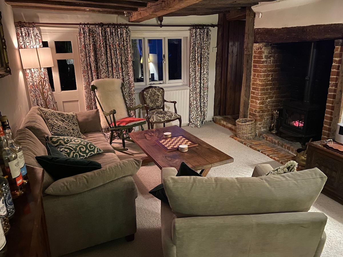 Water Meadow Cottage. A gorgeous 3-bedroom house, comfortably sleeping 6, ideal for families and anyone to unwind in all seasons. With a private south-facing garden full of flowers and birds, and secluded patio with delightful views across meadows. The stunning living room with original beams and bright windows is inviting in summer, and so cosy in winter with its wood-burning stove. Nestled in beautiful quiet countryside, a short drive from the coast, and Aldeburgh, Thorpeness, Orford.