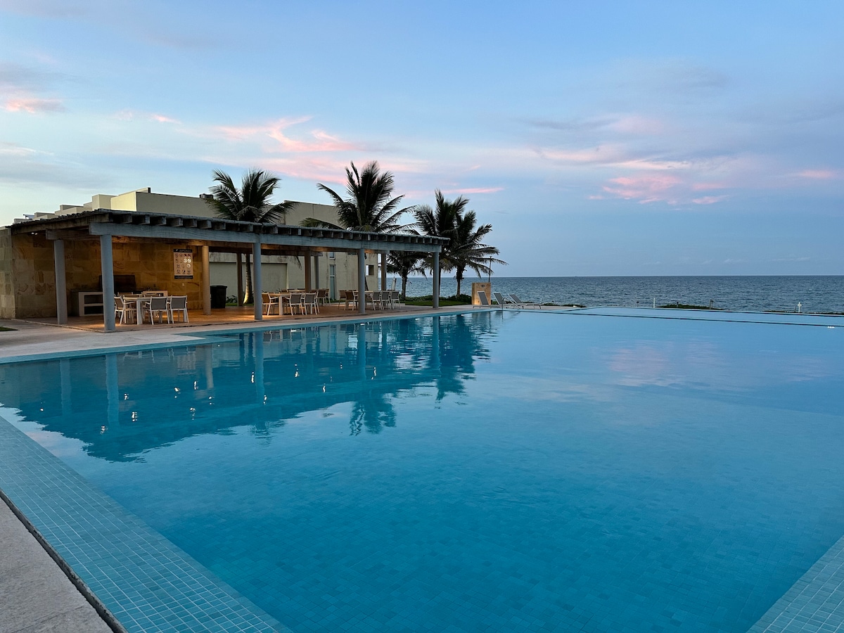 Vistas privilegiadas al mar desde el piso 10 en el fraccionamiento más exclusivo de la zona con acceso controlado y seguridad 24/7. Departamento moderno, amplio y bien equipado con terraza, alberca, asadores y gimnasio. Diseñado para que te relajes desde el primer minuto. Ubicado frente al mar, este espacio es ideal para quienes buscan una escapada tranquila y momentos inolvidables. Playa, estilo, lujo y comodidad en un solo lugar. Recibimos a familias y/o personas por estadías de trabajo
