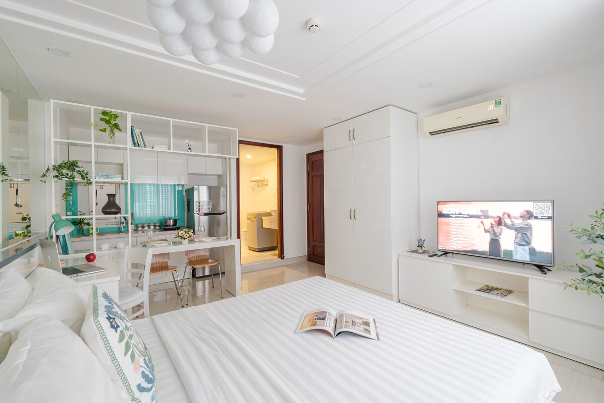 Apartemen studio yang dirancang dengan indah dengan segala kebutuhan Anda, berlokasi di pusat kota namun tersembunyi cukup untuk tidur malam yang damai jauh dari kebisingan kota yang berat. Cocok untuk wisatawan yang ingin menjelajahi Saigon dan mencari kenyamanan berkualitas dan pengalaman yang lebih lokal. - Kolam renang yang indah. - Wi - Fi cepat gratis, TV Kabel - Fasilitas gratis untuk tempat tinggal Anda: mesin cuci, pengering, AC, kulkas, air panas - Dapur dengan alat yang cukup untuk memasak Anda. Catatan: Tidak menyediakan/mendukung faktur PPN