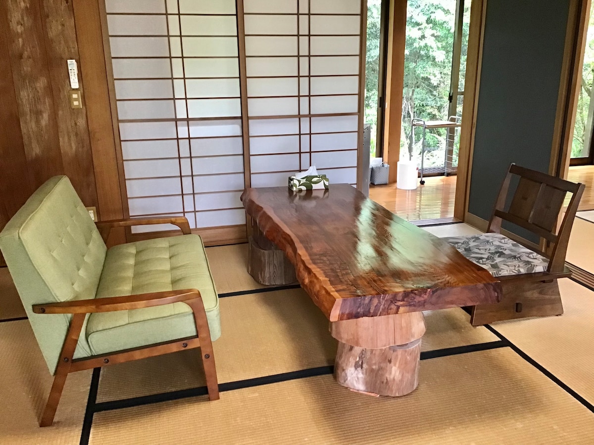 This location is very quiet & secret place for vacation home. There is a small Tatami room like a tea celemony room that you can use as yoga, meditation etc. for your private time. However, no kitchen facility. We provide an electric pot,cups,small dishies, refrigerater, microwave and oven grills toaster, so you can bring some food etc. There is sea and forest view from the guest cottage. Cottage is made in Japanese style with aromatic local cedar wood , open beams, and Shoji screens.