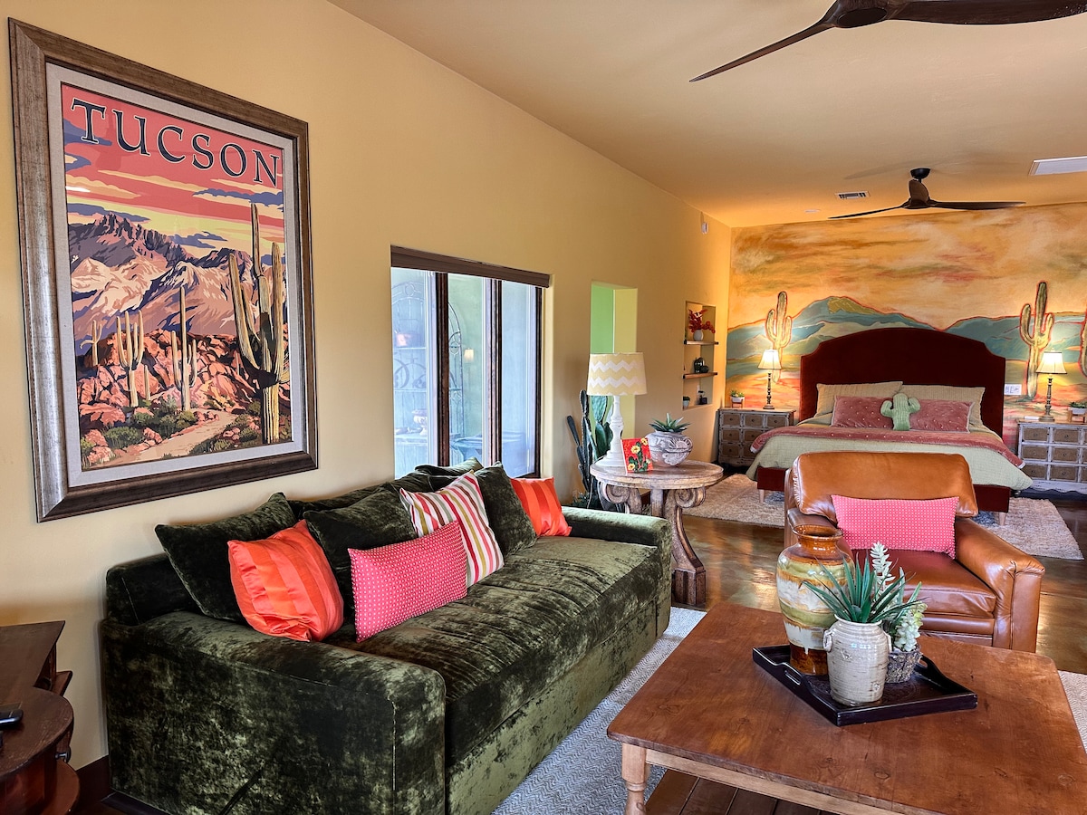 Nikmati budaya gurun barat daya yang menakjubkan dengan menginap di Flor De Luna Casita, yang terletak di hutan mesquite yang tenang, hanya beberapa menit dari pusat perbelanjaan dan restoran. Bersepeda yang fantastis dimulai tepat di luar pintu depan, dan banyak tempat hiking yang indah di dekatnya. Anda bahkan bisa berjalan bersama kambing! Pameran permata terbesar di dunia dan Fourth Ave Street Fair adalah beberapa atraksi musiman dan sepanjang tahun. Dirancang oleh seniman Arizona terkenal Ross Stefan, sentuhan artistik Casita tidak mengecewakan.