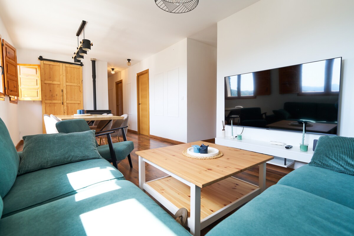 MOUNTAIN LOFT kami dirancang khusus untuk pasangan atau pasangan dengan anak-anak. Tempat ini menonjol karena kamarnya yang luas dan nyaman, semuanya dengan pemandangan pegunungan yang fantastis. - Ruang tamu dengan perapian dan pemandangan panorama. - Dapur berfasilitas lengkap. - Tempat tidur double dan sofa yang bisa dilipat. - Kamar mandi lengkap dengan batu alam. - Teras panorama yang hangat. - Dapur musim panas dengan barbecue dan oven kayu. - Kolam renang batu alam dengan area berjemur. - Air mancur, taman, dan teras yang luas.
