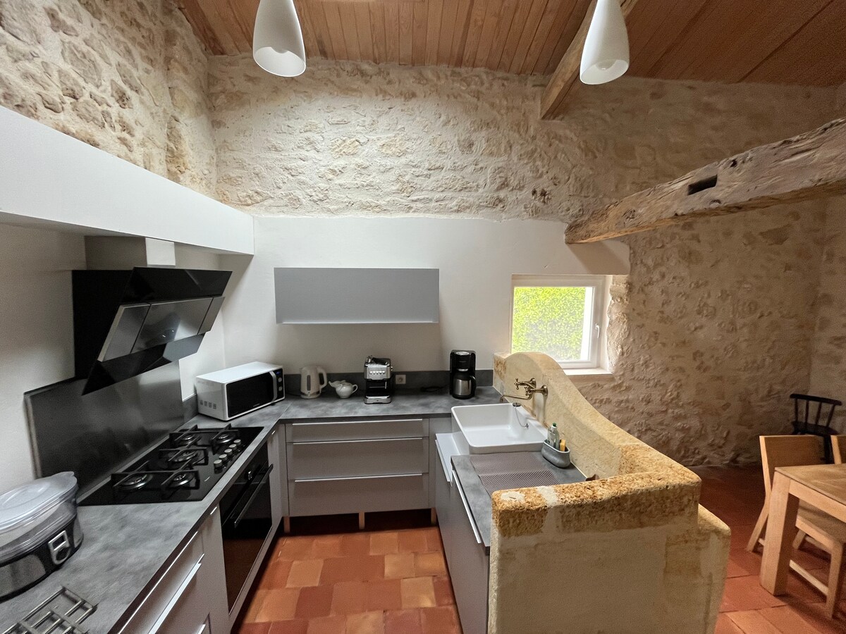 Terletak di jantung kilang anggur tua abad ke -17, rumah batu kami yang direnovasi dengan cermat menawarkan masa inap yang sangat santai. Tempat ini diklasifikasikan sebagai "BINTANG 4" dan menggabungkan pesona rumah batu tua dengan kenyamanan modern. Anda bisa beristirahat, bersantai di kebun permakultur, atau menikmati lingkungan tinggal Bordeaux yang semarak. Kastil anggur tetangga (Fronsadais, Pomerol, St. Emilion, dll) mengundang Anda untuk mencicipi anggur mereka.
