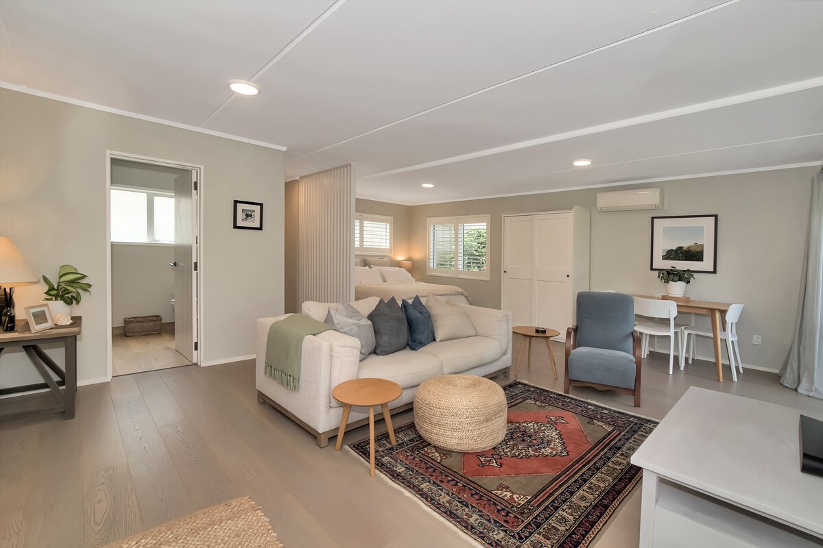 Studio Pantai Modern dengan pintu masuk ranchslider sendiri; garasi ganda integral memisahkan Studio dari rumah utama. Pintu di Studio mengarah ke garasi (dapat dikunci dari sisi Anda). Jika Anda ingin menyimpan apa pun yang Anda butuhkan untuk meminta ini, pintu juga terkunci dari sisi garasi. Studio memiliki langit-langit tinggi, kaca ganda, pompa panas/AC. 200 meter ke pantai, 1,2 km ke Fashion Island & Papamoa Plaza, mudah berjalan kaki 15-20 menit melalui reserve dengan jalur pejalan kaki/bersepeda. 6 km ke Bayfair. Lokasi yang tenang.