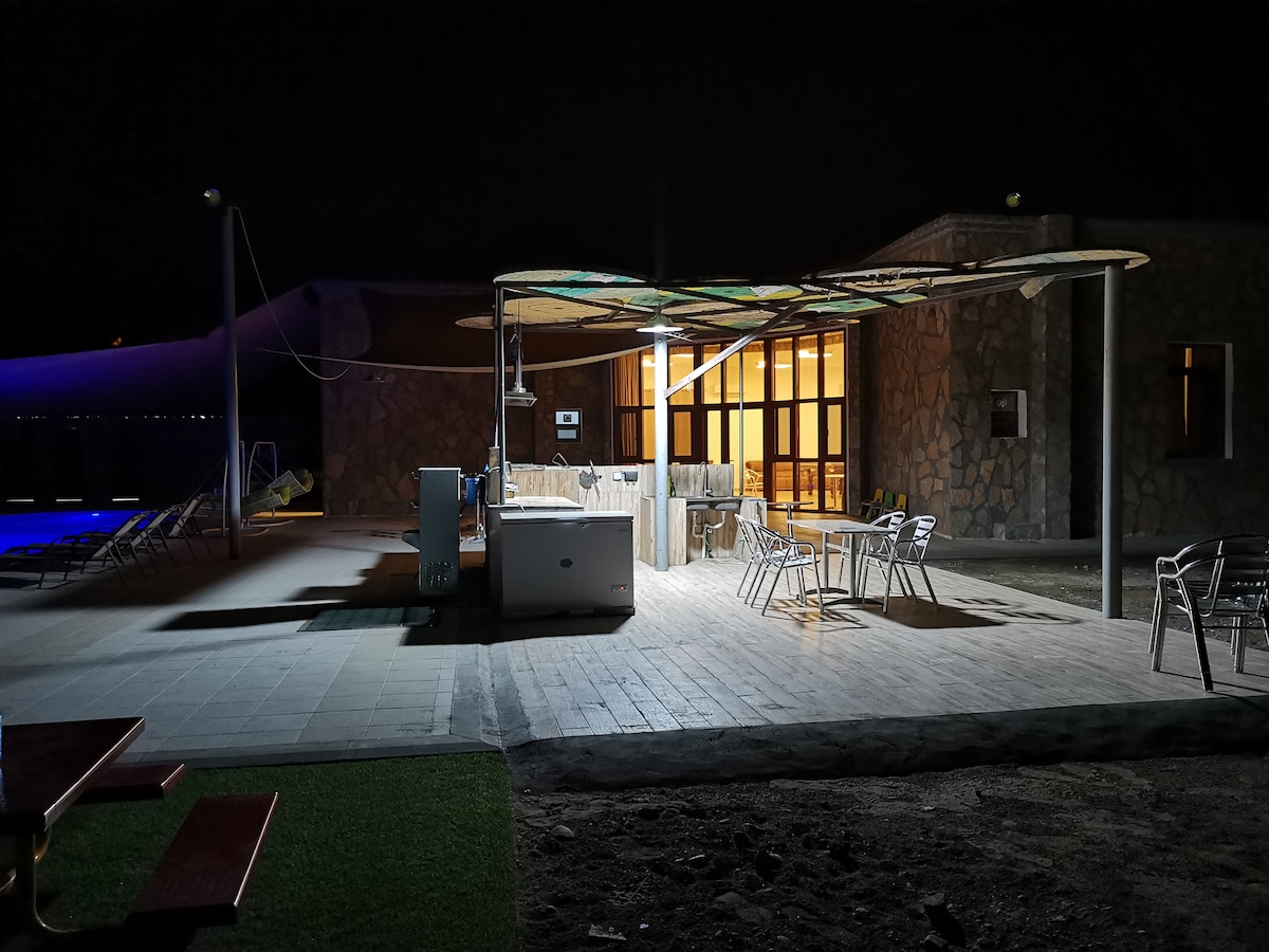 Ini adalah dua chalet dengan desain, detail, dan lokasi yang sama, dan dengan privasi lengkap. Chalet dirancang untuk dua orang tanpa anak. Maksimum 5 anak perempuan diperbolehkan untuk reservasi tanpa menginap dan tanpa anak pendamping Tempat ini telah dikoordinasikan dan dirancang dengan cermat untuk menyediakan tempat bagi pasangan untuk bersantai dalam gaya yang sangat canggih dan khas, dan sepenuhnya terkoordinasi dalam hal bahan yang digunakan, perabot, finishing halus, dan pencahayaan. Fasilitas untuk setiap chalet Sudut kopi dalam ruangan. Kolam renang berpemanas Area barbekyu lengkap Layanan Keranjang camilan gratis untuk semua pemesanan Kopi dan air minum untuk semua reservasi.