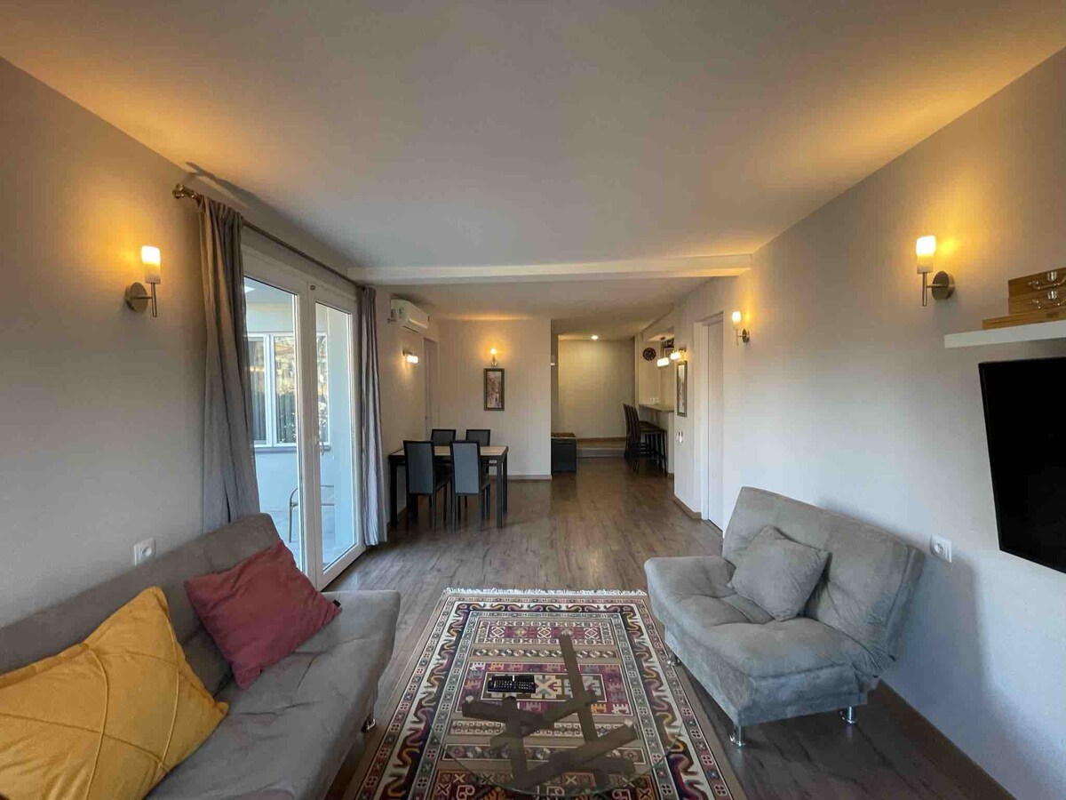 Townhouse berstandar tinggi di jantung kota Tbilisi dengan teras santai dan taman buah dengan pemandangan. Direnovasi sepenuhnya dengan desain modern, sangat cocok untuk dua pasangan, sekelompok teman atau keluarga dengan anak - anak. Lokasi terbaik di kota, area aman dan ramah, 2 menit berjalan kaki dari jalan Rustaveli dan stasiun metro dan jarak berjalan kaki dari setiap tempat menarik, namun tenang dan tersembunyi dari kebisingan dan hiruk pikuk kota. Dibersihkan secara profesional di setiap masa inap.