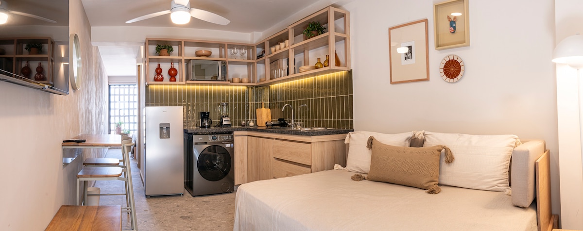 - Studio eksekutif yang nyaman dan eksklusif dengan tempat tidur queen-size, meja dan AC. - Balkon untuk udara segar - Dapur yang lengkap. - Masuk dengan smart lock dan kunci khusus dan eksklusif untuk setiap tamu. - Atap Panorama dengan Restoran di Lantai 9 - Ruang pertemuan dilengkapi untuk pertemuan profesional (periksa ketersediaan) - Akses 24/7 dengan kode khusus. PENTING: Kami tidak memiliki tempat parkir pribadi di dalam properti.