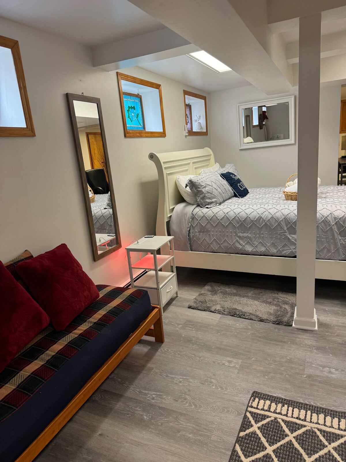 This spacious and serene space has an attached garage. Street parking is allowed until October 15, 2025. You may also park in the attached garage as best you can. Up to you. Set the heat or AC, watch TV, nuke a meal, do some laundry, and there's a small office to gather your thoughts. There's high speed WI-FI and your own private entrance through your garage to come and go as you please.