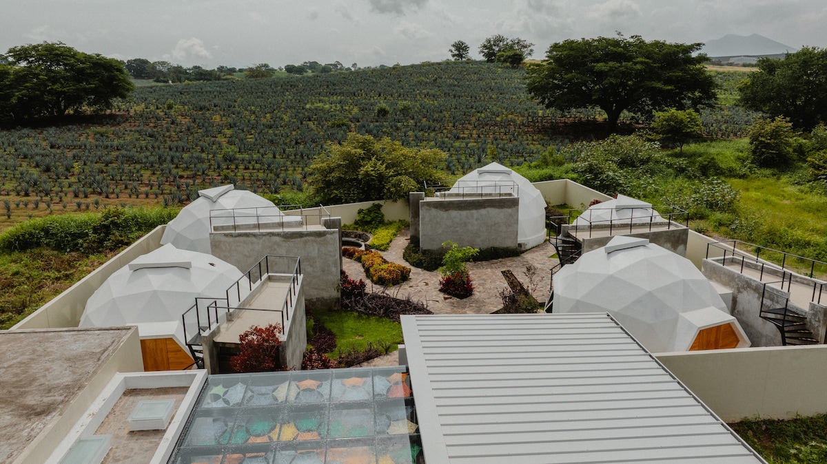 Domo Agave Azul “Glamping dengan Jacuzzi Pribadi di Tequila – Domo Agave Azul - Magnolia Homes Mx. untuk 2 orang” Nikmati pengalaman tak terlupakan di tengah ladang agave, kubah modern yang dirancang untuk beristirahat dan terhubung dengan alam Domo Agave Azul dirancang untuk pasangan yang mencari privasi dan kenyamanan, menggabungkan pesona glamping dengan kemewahan hotel butik di jantung kota Tequila