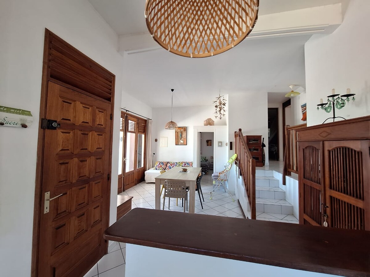 Feet in the water on a white sand beach our house is located in Terre - de - Haut in the Saintes archipelago (Guadeloupe), located in the heart of its wonderful bay and in the typical fishermen's area of Fond de Curé. Dekat dengan semua fasilitas, tidak perlu menyewa kendaraan untuk bahan makanan Anda atau ke pantai, semuanya ada di lokasi. Rumah berukuran dupleks 90 m2 dengan teras 30 m2 di atas laut. Kenyamanan, ketenangan, dan keindahan akan menyenangkan Anda dengan kebahagiaan.