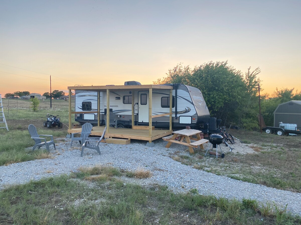 Benar - benar TEMPAT GLAMPING dan BUKAN perkemahan normal Anda. Dilengkapi dengan permainan dalam/luar ruangan/Lubang Api Besar/ 4-6 p Hot Tub, Barn & RV unik ini terletak 1 hingga 1-1/2 jam dari area McKinney & Dallas. Fire Pit (termasuk kayu), jalur lintas alam/lumbung yang sepenuhnya tertutup & berpendingin udara dengan TV 55”, Starlink, dekat dengan tempat memancing, 3 trek tanah North Tx *Parkir perahu/jet ski dengan sambungan listrik & air * RV 2 BR & 2 kamar mandi lengkap M BR Tempur-Pedic Queen kasur. 2nd BR 2 bunks, sofa tarik, LR sofa tarik, dapur makan