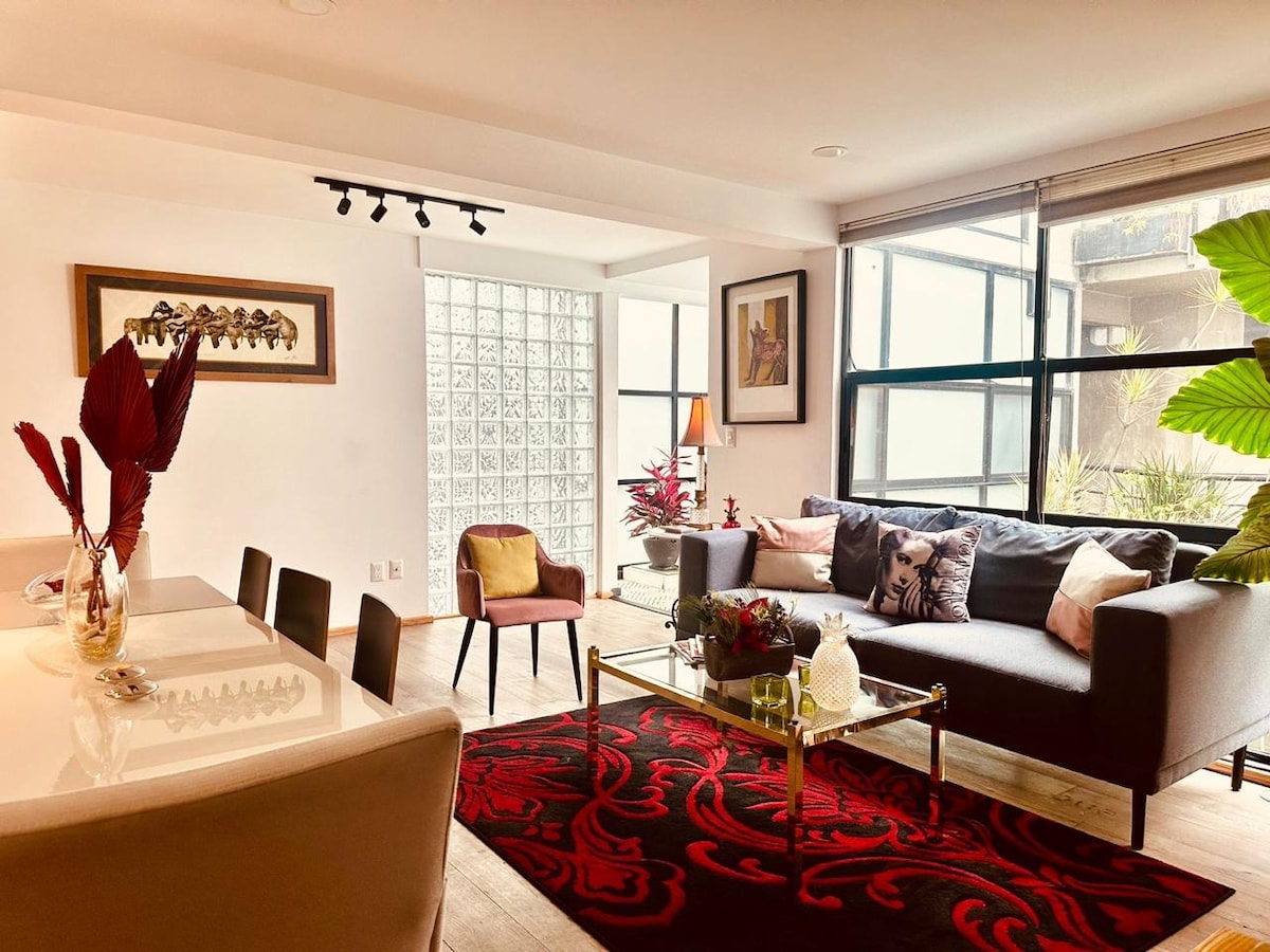 "Tradisi Meksiko ", terletak di gedung Porfirian di Roma Norte, dihiasi dengan referensi tradisi Meksiko. Tempat ini memiliki: kamar mandi yang luas dan lengkap; mesin cuci berlokasi strategis; dapur dilengkapi dengan pemanggang, microwave, dan kulkas; ruang makan dengan meja dan kursi untuk empat orang; ruang tamu dengan sofa dan kursi untuk bersantai. Kamar tidur utama dengan tempat tidur king size, lemari, TV, dan AC. Akses ke taman dari ruang tamu dan kamar tidur. Sangat cocok untuk masa inap jangka panjang.