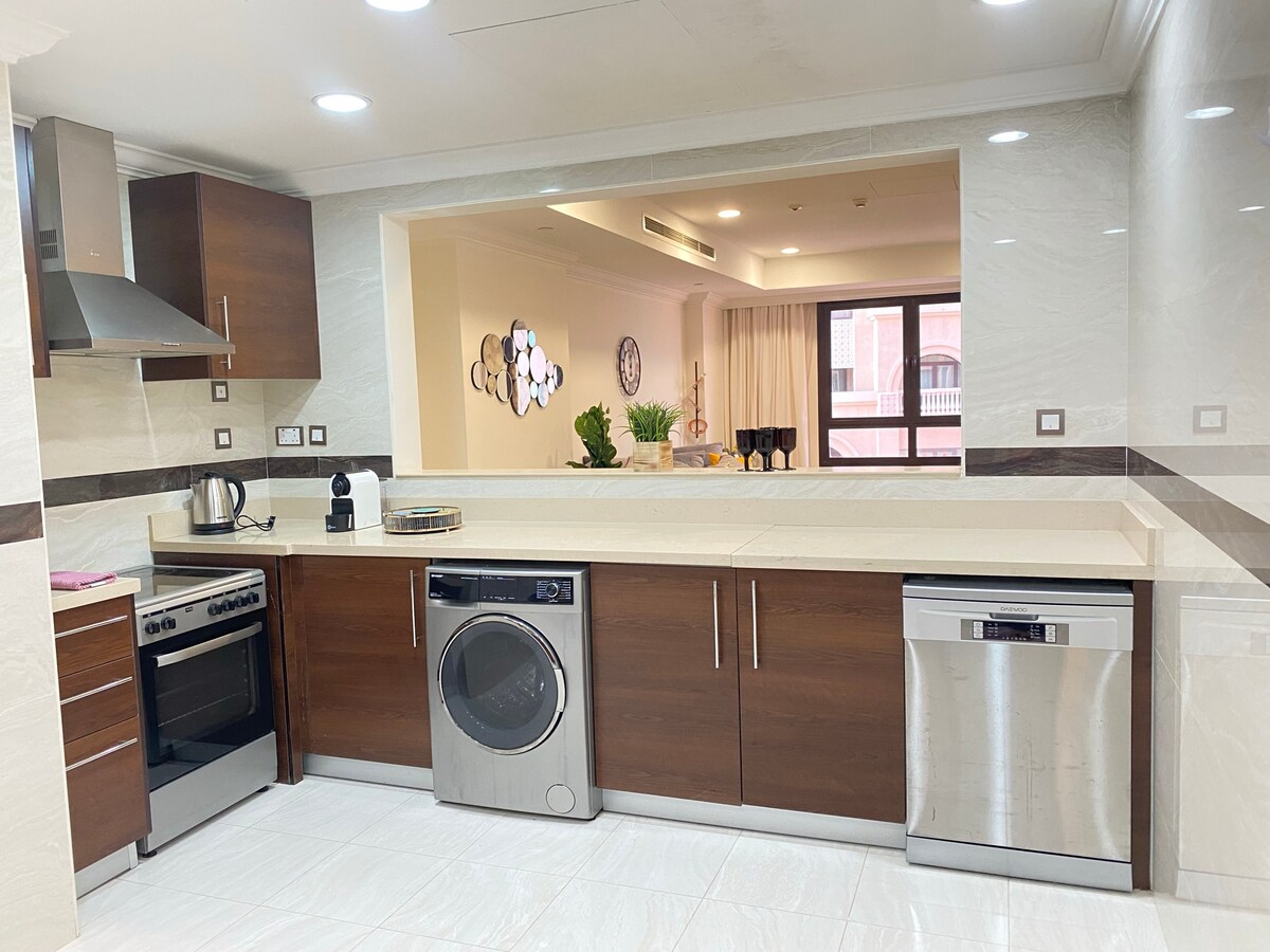 Bangunlah untuk menikmati pemandangan marina yang berkilau di apartemen 1BR yang luas di Porto Arabia, The Pearl - Qatar. Nikmati balkon pribadi, tempat tidur king, 1,5 kamar mandi, dapur lengkap, lemari built - in, dan area tamu yang luas dengan TV pintar 65". Cocok untuk pasangan, tamu solo, atau pelawat bisnis. SPAR supermarket di lantai bawah, ditambah kafe dan toko di dekatnya. Termasuk Wi - Fi cepat, parkir, mesin cuci, seprai bersih, dan keamanan 24/7. Tenang, bergaya, dan beberapa langkah dari air, liburan Qatar Anda yang sempurna!