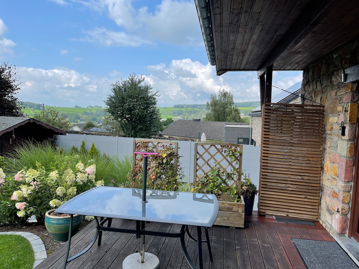 Di tempat yang tenang di pusat Ardennes, Anda bisa menginap bersama kami dalam keheningan dan kemewahan. Gites kami dibangun secara berkelanjutan dengan lapisan bahan alami berkualitas tinggi. Kami dengan senang hati menyambut Anda di akomodasi kami yang dilengkapi dengan tempat tidur berukuran king, shower walk - in, dapur lengkap (mesin cuci piring, mesin Nespresso), AC, dan kompor kayu. Nikmati kesehatan Anda sendiri dengan sauna luar ruangan dan jacuzzi kami, benar - benar pribadi dengan pemandangan indah di atas perbukitan Ardennes.