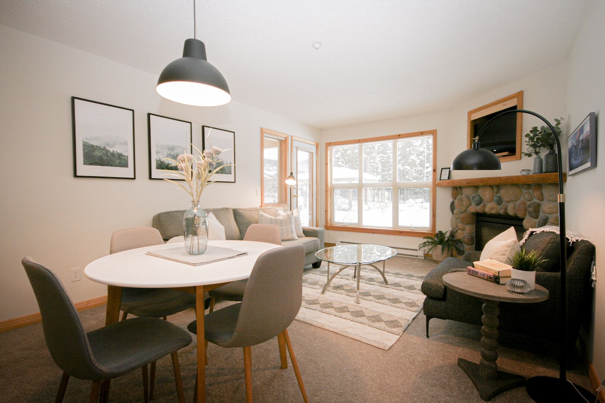 Kondominium dua kamar tidur dan dua kamar mandi kami memiliki tempat tidur berukuran king di kamar tidur utama, tempat tidur susun twin - over - queen di kamar tidur kedua, lantai ubin berpemanas di kamar mandi, dan area dapur, dapur lengkap, perapian gas yang nyaman, kabel full HD dengan Smart TV 55 inci di kamar yang luar biasa dan Smart TV 42 inci di kamar tidur kedua, internet nirkabel, bak mandi air panas Jacuzzi J425 baru, pemanggang BBQ, mesin cuci/pengering, dan pemandangan spektakuler!