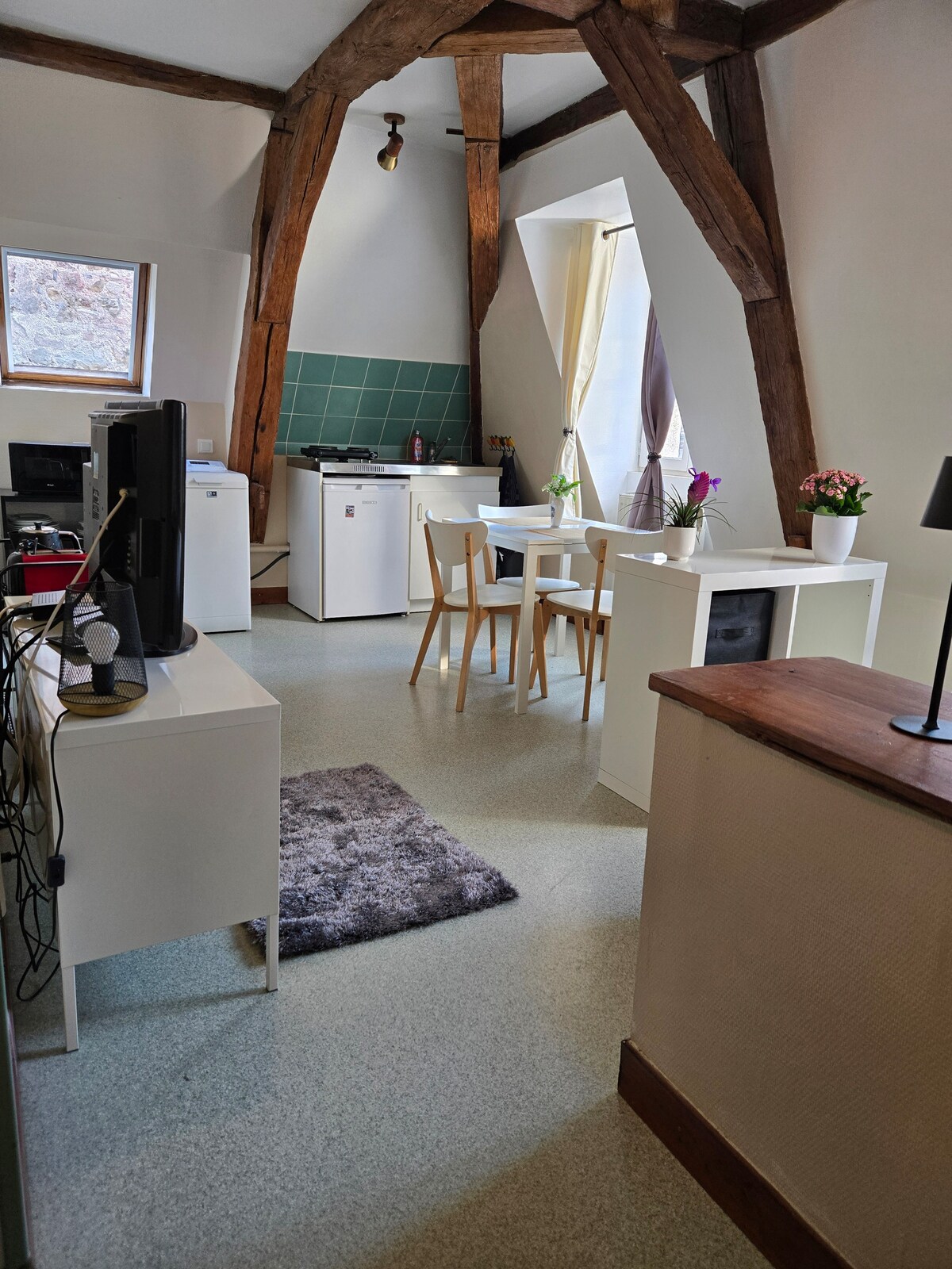 Je vous propose un studio de 38 m2, confortable et cosi, entièrement rénové, bien équipé, avec une literie de qualité. Il est situé au rez de chaussée d'un immeuble ancien, avec vue sur la collégiale et cour intérieure. Sa situation centrale vous permet de profiter à pieds de cette jolie ville médiévale. A moins de 5 min : - marché dominical, nombreux commerces, restaurants. - monuments, musée, cinéma, théâtre et attractions. -parkings gratuits (sur la place c'est limité à 1h30.)