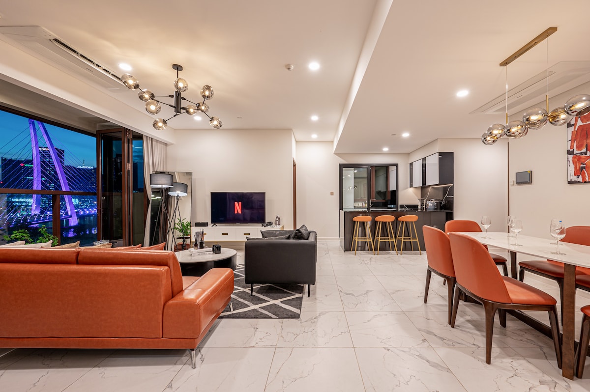 Selamat datang di The Crest Residence! (V Living) Apartemen bergaya New York yang nyaman, seperti sekotak permen berwarna-warni, di lantai paling atas dengan pemandangan Jembatan Ba Son dan Sungai Saigon yang berkilauan. Saat matahari terbenam, lampu keemasan hangat memenuhi ruangan, menyatu dengan cahaya di luar. Setiap sudut penuh dengan warna dan detail yang bijaksana yang membawa kegembiraan dan kenyamanan. Buat kopi Anda, masak sesuatu yang enak, dan nikmati keajaiban malam Saigon dari atas.