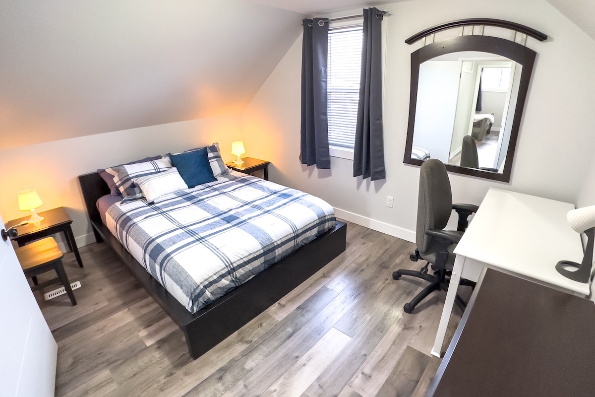 *Welcome to our professionally updated and decorated home. *Relax with friends and family in the comfortable living room with Roku TV, leather reclining couch and electric fireplace. *Enjoy a meal in the modern kitchen with new appliances, cabinets and granite countertops. *Get a good night’s sleep in one of 4 bedrooms of various sizes, with 4 queen beds and 1 twin bed, 3 desks. 2 piece washroom on the 2nd floor. *Bikes provided for the bike path.