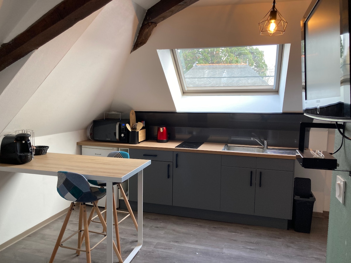 Studio 25m2 yang menawan di lantai dua dan atas ini tanpa akses lift. Datanglah dan temukan desa - desa terdekat. Keuntungan besar, stasiun kereta api hanya berjalan kaki singkat ke apartemen yang mengarah langsung ke pusat kota Angers (8 menit). -12 menit dari expo park dengan mobil - Tiercé/Angers berjarak 20 menit dengan mobil. Terra botanica Kastel Jangan ragu