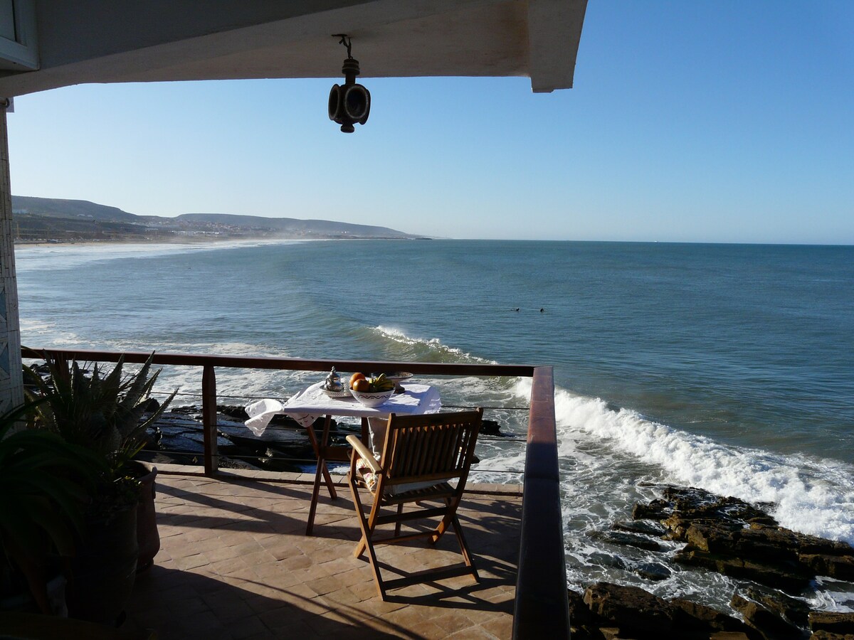 Beautiful small apartment on the third floor with big terrace and great 180 degrees oceanview. Newly refurbished, direct acsess to the Atlantic ocean. I the middle of Taghazout, Moroccos surfing village number one. Great sunsets.