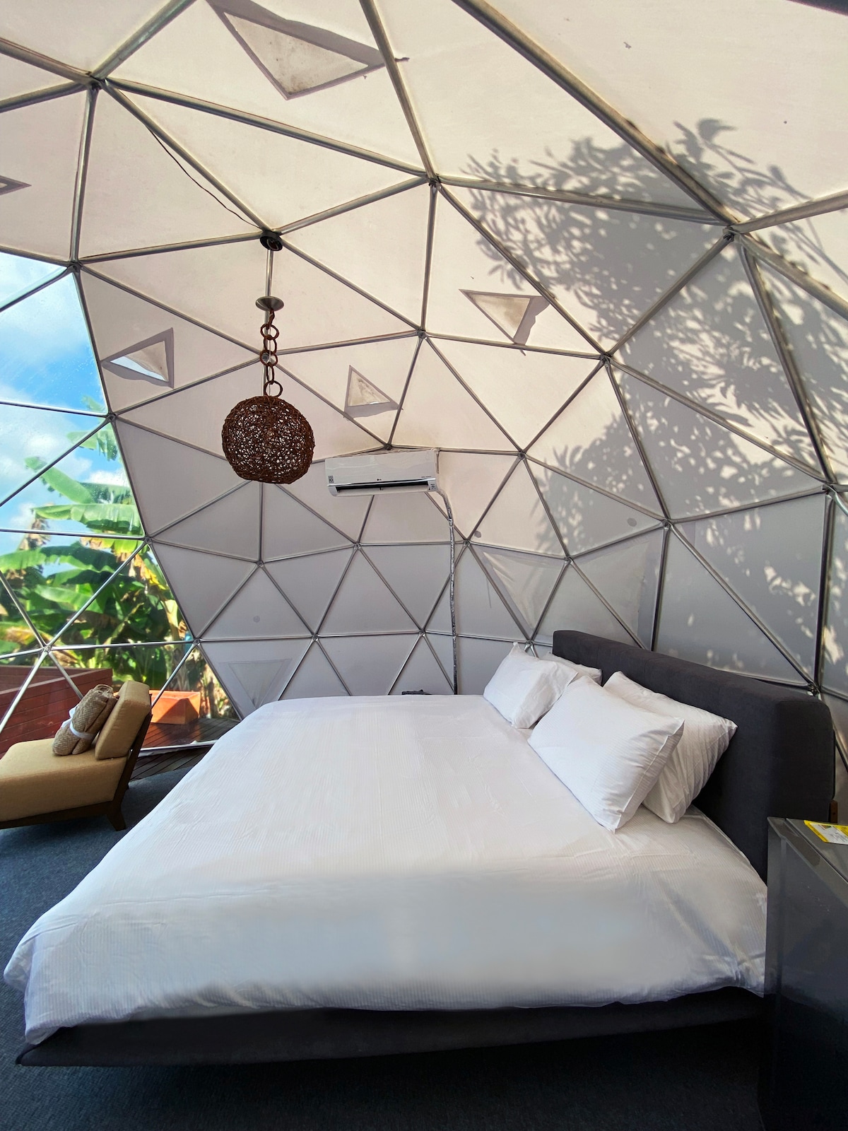 Kubah ramah lingkungan yang terbuat dari bahan daur ulang, bentuk geodesik, dengan bagian kaca yang memungkinkan Anda menikmati pemandangan budaya pembuat kopi dan langit - langit kaca untuk melihat bintang - bintang dari tempat tidur Anda. Demikian juga, Anda bisa bersantai di Jacuzzi pribadi dengan 120 jet pijat hidro, bersama pasangan Anda dan menikmati kehangatan api di tengah alam.