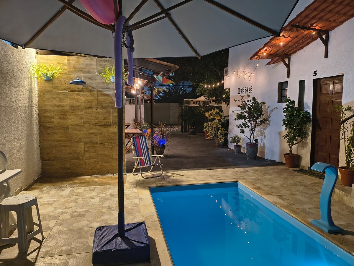Rumah yang nyaman untuk bersantai di tepi pantai. Ada dua kamar tidur, dapur lengkap, ruang adaptif kantor, balkon, dan lampiran luar ruangan untuk makan siang /makan malam khusus. Tempat ini mengakomodasi hingga empat orang dengan cara yang nyaman. Wi - Fi internet di seluruh rumah ; Smart TV terhubung ke Netflix Youtube, dll... Dapur dilengkapi kompor, kulkas, blender, Air Frier dan peralatan lainnya. Rumah ini berlokasi di dalam Situs Bungalows Gameleiro.